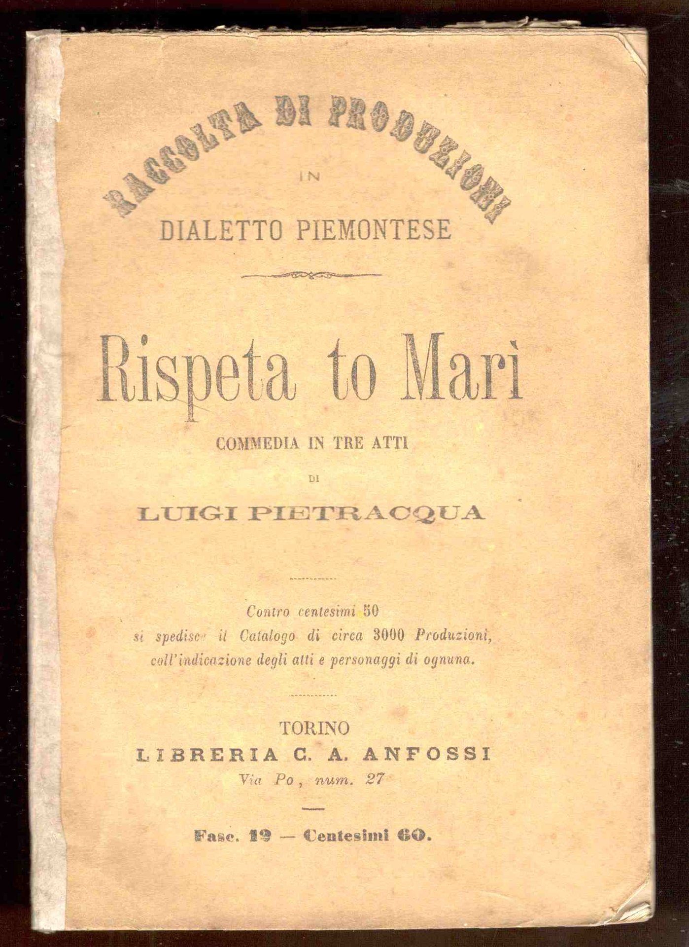 Placchetta in 16°, pp. 52. Brossura editoriale a stampa (dorso foderato). Ingiallitura ma copia in ordine. Raccolta di produzioni in lingua piemontese.