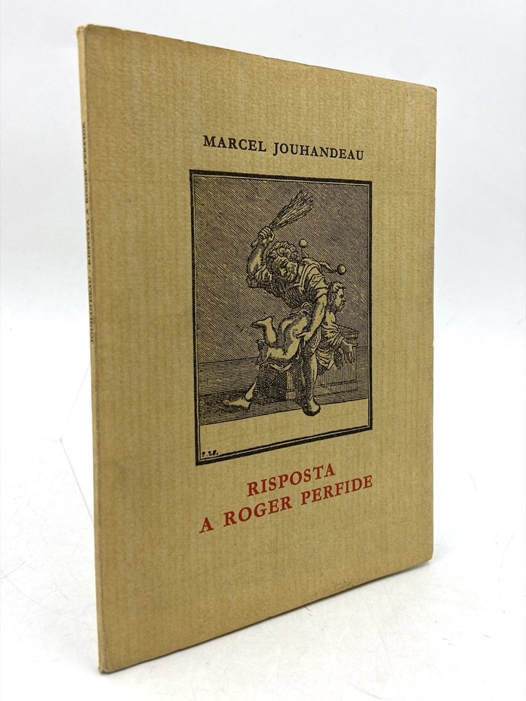 Brossura editoriale con sovraccoperta illustrata in carta vergata e filigranata, cm 18 x 12.5, pp 28 (4). Prima e unica edizione italiana di «Riposte à Roger Perfide» (1965), con traduzione di Caterina Longanesi. Volume primo della collana La Coda di Paglia. A cura di Vanni Scheiwiller, impresso in 1000 esemplari numerati dalla tipografia U. Allegretti di Campi il 30 aprile 1966.