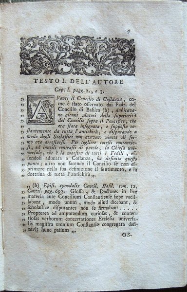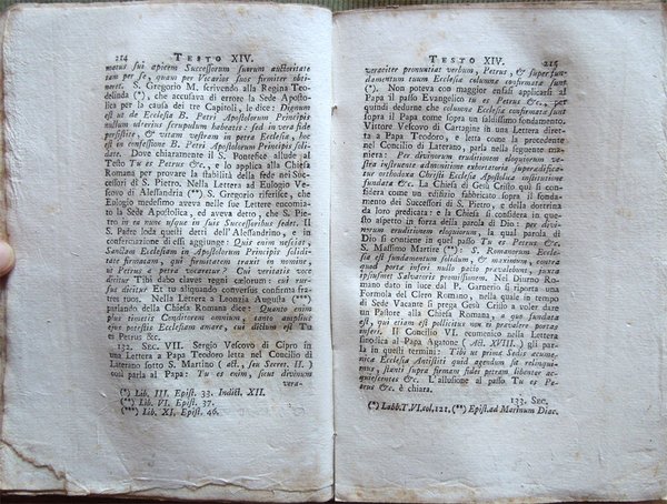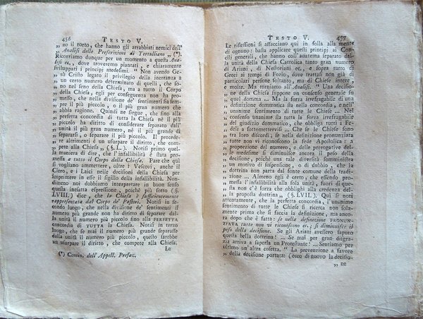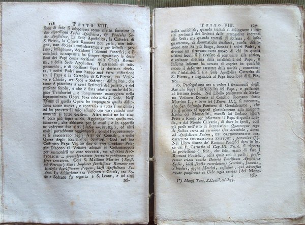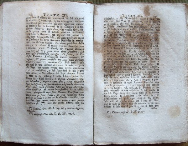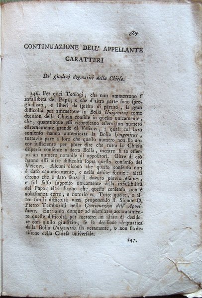 In-8° (19,3 x 14 cm), pp. 566, (2), legatura coeva in cartone semirigido, con titoli manoscritti al dorso (legatura d'attesa, con alcuni fascicoli legati un po' larghi, comunque ben salda, con normali segni del tempo). Al fascicolo Q (pp. 241-256), l'inchiostro, ossidandosi, ha determinato la formazione di bruniture. Qualche segno d'umido, normale patina del tempo alle pagine, nel complesso buon esemplare, in barbe editoriali. Giovanni Vincenzo Bolgeni nacque a Bergamo nel 1733. Gesuita, insegnò a Macerata fino a quando, nel 1773, venne sciolta la Compagnia. Segnalatosi per la sua produzione polemica contro il giansenismo, nel 1787 fu nominato teologo della Sacra Penitenzieria. È noto per aver sostenuto la liceità del giuramento alla Repubblica Romana del 1798: solo l'esplicita condanna del giuramento da parte di Pio VI lo indusse a ritrattare le sue dottrine. Privato del suo ufficio, continuò nei propri studi, per lo più pubblicati postumi. Morì a Roma nel 1811. Nello scritto in questione polemizza con il giansenista bresciano Pietro Tamburini, autore delle opere Cosa è un appellante e Continuazione dellAppellante.