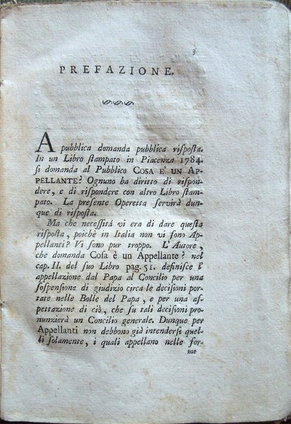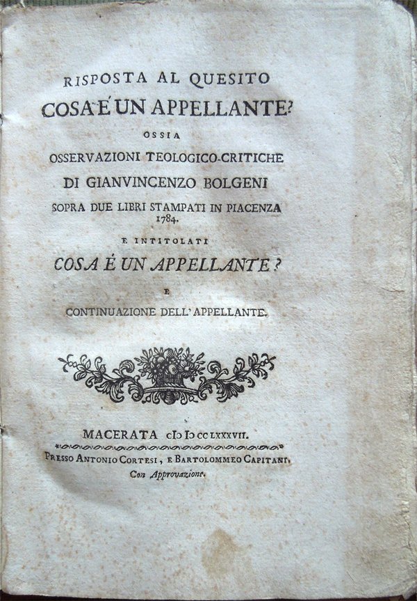 Risposta al quesito: Cosa è un Appellante? Ossia osservazioni teologico-critiche di Gianvincenzo Bolgeni sopra due libri stampati in Piacenza, 1784 e intitolati Cosa è un Appellante? e Continuazione dell'Appellante