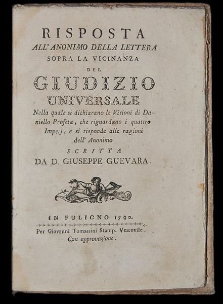 In 8° (18×12,5 cm); 91, (1) pp. Legatura coeva in piena cartoncino, un leggero alone al margine interno. Carta leggermente ed uniformemente brunita. Piccola incisione xilografica al frontespizio. Iniziali, finalini e testatine xilografici. Prima rara edizione stampata a Foligno da Giovanni Tommasini di questo curioso scritto di Giuseppe Guevara con il quale lautore vuole rispondere ad unanonima pubblicazione stampata nel 1789 a Fermo che preannunciava limminente fine del mondo. Lautore inizia prendendo in considerazione la difficoltà di capire ed interpretare correttamente le visioni. Segue una dissertazione sulla difficoltà di dare una chiara data allavvento dellAnticristo secondo quanto si può sapere secondo la dottrina cattolica. Analizza poi i segni che anticiperanno il giudizio universale dimostrando come non è sicura una loro chiara disposizione temporale. Si analizza anche la profezia dellanticristo legata al Corno, a Gerusalemme ed ad Antioco in vari capitoli come quello dal titolo Principio ed ingrandimento d Antioco dichiarato per il Corno Piccolo fatto grande e anche la profezia di Ezechiele. Esemplare raro, ancora in barbe ed in buone-ottime condizioni di conservazione.