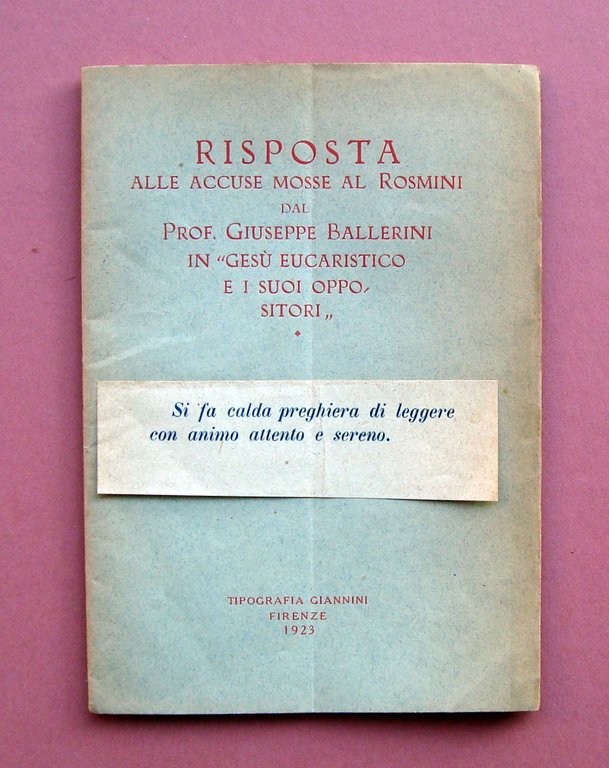 Libretto, Risposta alle accuse mosse al Rosmini dal Prof. Giuseppe Ballerini in Ges√π Eucaristico e i suoi oppositori" Tip. Giannini, Firenze, 1923; cm 18,5x13; pp. 32; br. ed.; peccetta dattiloscritta alla br.ant. Condizioni di conservazione. Esemplare in buone condizioni con tracce del tempo; piega conservativa; brossure e interni con bruniture ai margini. OPEB.5329 blu "