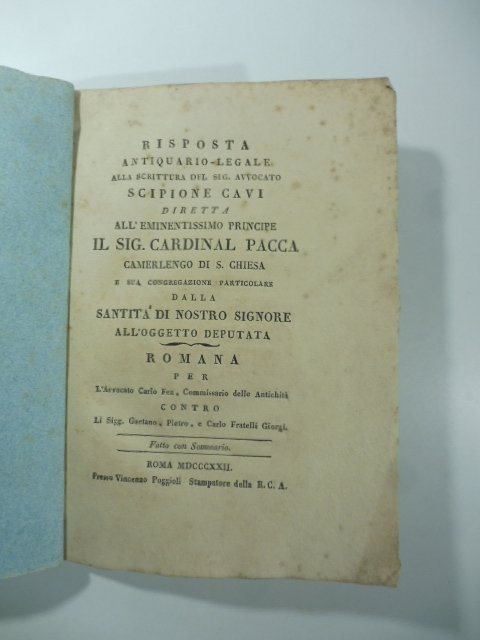 Risposta antiquario legale alla scrittura del Sig. Avvocato Scipione Cavi diretta all'Eminentissimo Principe il Sig. Cardinal Pacca.Romana pe l'Avvocato Carlo Fea commissario delle antichita' contro li Sig.Giorgi