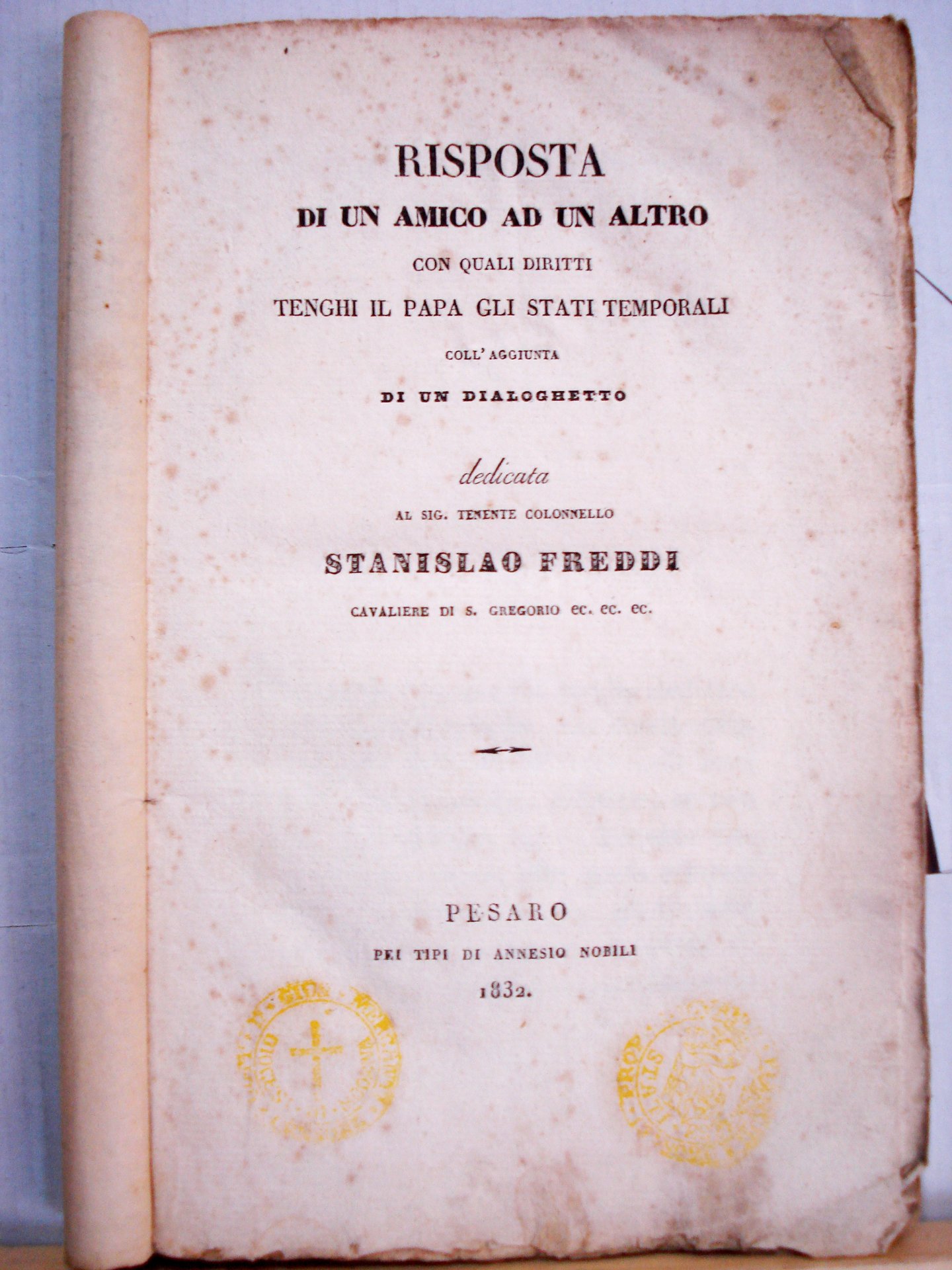 RISPOSTA DI UN AMICO AD UN ALTRO CON QUALI DIRITTI TENGHI IL PAPA GLI STATI TEMPORALI, coll' Aggiunta di un dialoghetto dedicata al sig. Tenente Colonnello STANISLAO FREDDI Cavaliere di S.Gregorio ec. Ec. Ec.