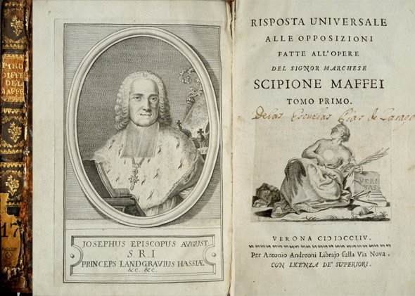 Risposta universale alle opposizioni fatte all'Opere del Signor Marchese Scipione Maffei.Tomo Primo (unico pubblicato). (Seguido de:) Orazione Paneretica ai Signori Accademici Filarmonici di Verona.