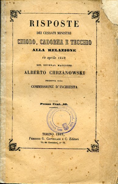 Risposte dei cessati Ministri Chiodo, Cadorna e Tecchio alla relazione 10 aprile 1849 del General Maggiore Alberto Chrzanowski prodotta alla Commissione d'Inchiesta