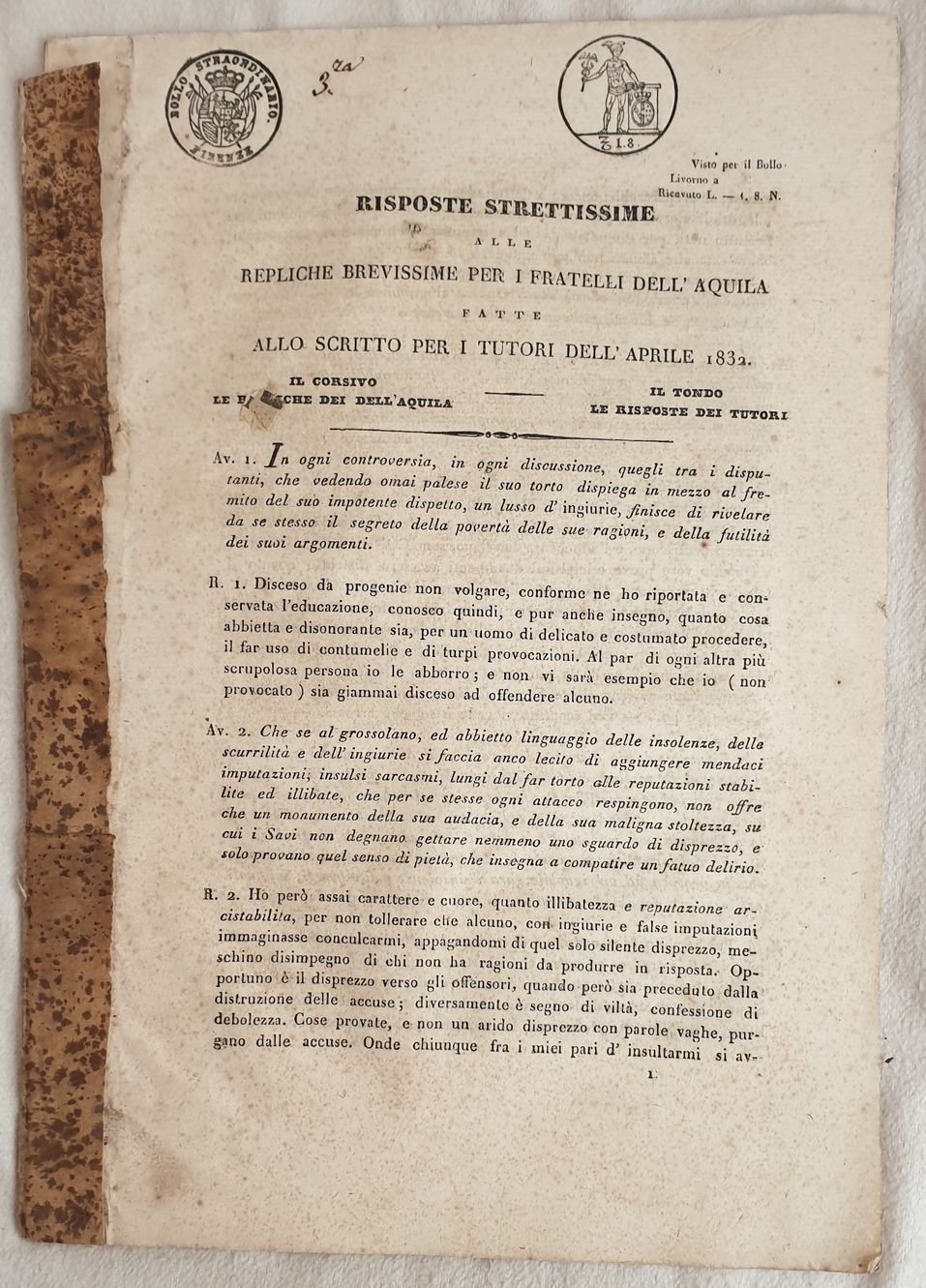RISPOSTE STRETTISSIME REPLICHE BREVISSIME PER I FRATELLI DELL'AQUILA ALLO SCRITTO PER I TUTORI DELL'APRILE 1832