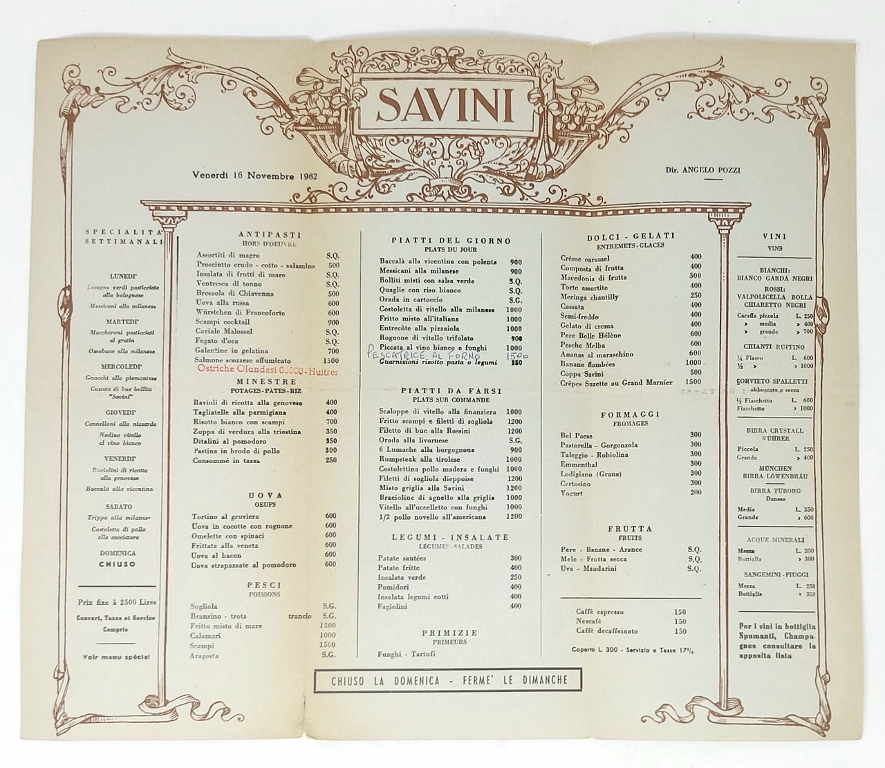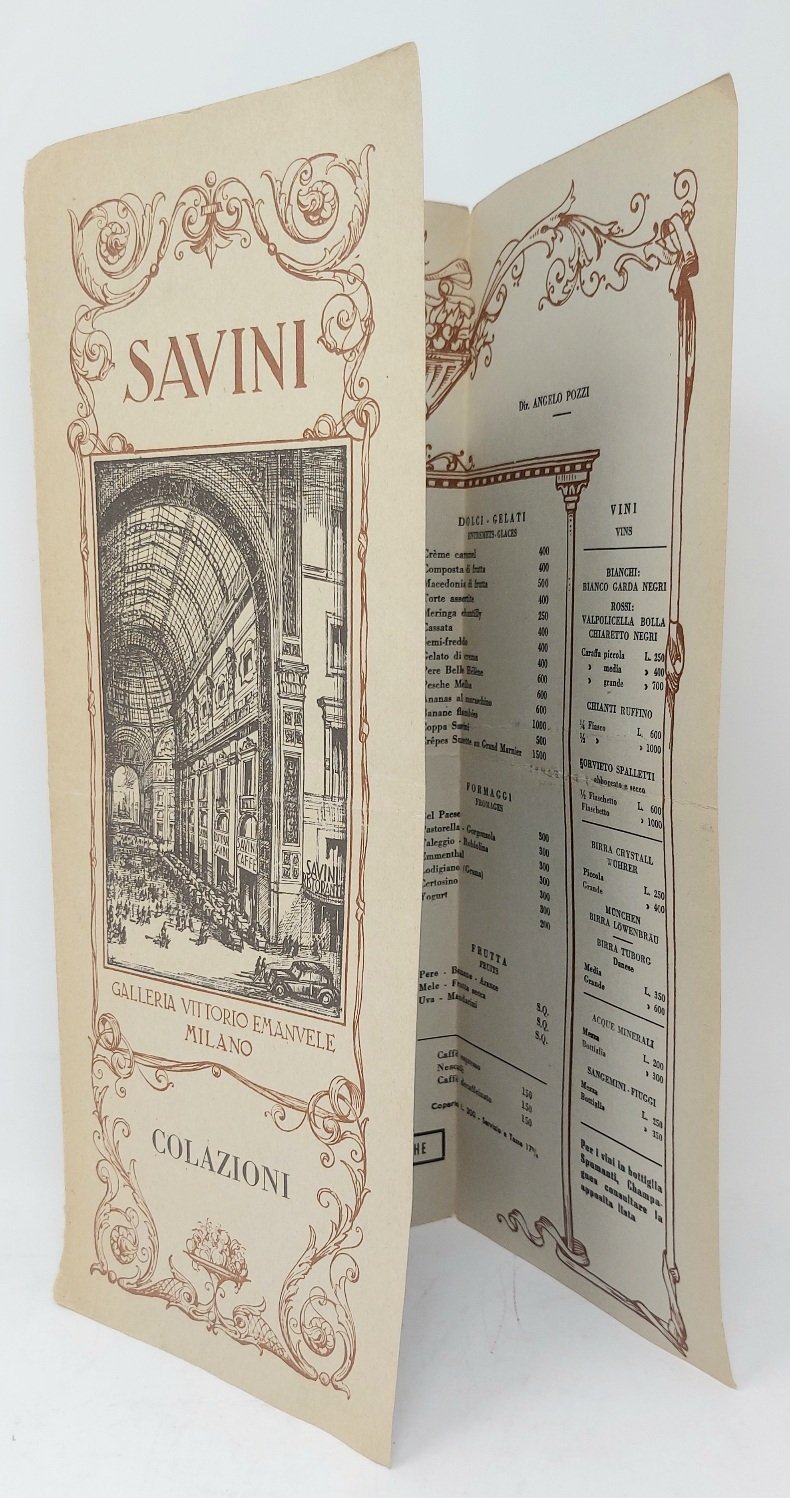 >Menù ripiegato in 3 (332x395 mm), elegantemente impresso in nero e bistro, figurato con immagine del ristorante all'interno della Galleria Vittorio Emanuele di Milano, voci del menù entro cornice figurata. Ricco menù delle colazioni sotto la direzione di Angelo Pozzi, titolare dal 1923 del Savini di Milano, storico ristorante di lusso aperto nel 1867. Perfettamente conservato, con aggiunte a timbro rosso (Ostriche olandesi) e a mano (Pescatrice al forno), lieve segno di piegatura centrale.