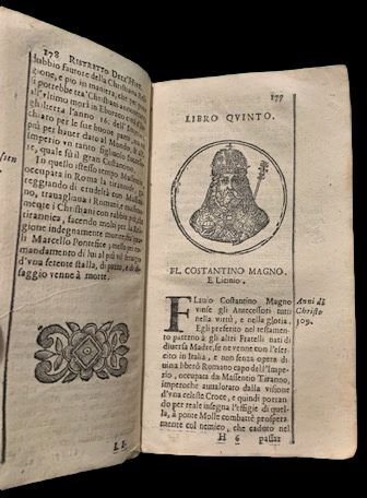 In 12° (13,2x7,5 cm); (24), 514, (2), 239, (11), (2), 67, (5), 7, (1) pp. Legatura coeva in piena pergamena (mancanza al margine basso del dorso. All'interno esemplare solido, ben legato ed in buone-ottime condizioni di conservazione. Ogni forntespizio si presenta in cornice a doppio filetto. Antiche firme d'appartenenza antiche alle prime due carte, alcune leggibili altre in parte cancellate Bennarum comiti, Presbiteri Aragni. AL frontespizio piccola veduta di Venezia. Numerosi ritratti di personaggi illustri entro medaglioni, nel testo all'inizio dei capitoli della prima parte. La seconda parte con frontespizio proprio Ristretto dell'historie del mondo. Dall'Anno M.DC.L. Fino al M. DC. LXIII. Parte Seconda di Bernardo Oldoini Genovese, mentre la parte terza porta il titolo Ristretto dell'Historie del mondo. Dall'Anno M. D. LXIII. Parte Terza. Del Sign. Dottor A. M. B.. Edizione fra le più complete, con tutte e cinque le parti, di una delle opere più importanti opere del noto scrittore e storico gesuita, Orazio Torsellini (in latino Horatius Tursellinus e in francese Horace Turselin, 1545 -6 aprile 1599). Romano di nascita, insegnò belle lettere al Collegio Romano e fu, poi, direttore del seminario che l'istituto aveva all'epoca a Roma. Fu rettore, anche, a Firenze e Loreto. Autore di diverse opere sia a carattere storico che religioso, fu scrittore erudito ed elegante. L'opera qui presentata ebbe enorme successo tanto da essere ristampata con aggiunte, fino a tutto il settecento. Nella versione qui presentata, la continuazione dell'opera di Torsellini è affidata sia al dottore in filosofia, giurista e gesuita perugino, Aurelius Ludovicus (1560-1637, anche se alcune fonti riportano come data di nascita il 1592) che al al genovese, Bernardo Oldoini che continuò la narrazione del Torsellini dall'anno 1650 fino al 1668 . In questa edizione vi sono poi altre due parti aggiunte. L'opera apparve per la prima volta, con la sola prima parte, nel 1598, a Roma, con il titolo di Epitome historiarum a mundo condito ad anno 1598. L'edizione qui presentata è una ristampa dell'edizione che Brigonci editò nel 1561 con l'aggiunta, però, di alcune parti. Edizione non comune. Rif. Bibl.: ICCU IT\ICCU\RMLE\026975.