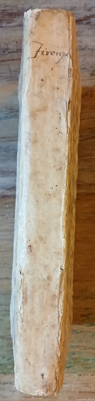 In 12° antico (cm 16,2 x 9), cartone coevo con carta spugnata policroma applicata ai piatti, pp. (XI,(1),226,(2), con marca tipografica, testatine, capolettera e finalini ornati in xilografia, una pianta di Firenze fuori testo ripiegata, disegnata da Vannius ed incisa in rame da Bellon. Da pag. 150 a pag. 202 la "Parte seconda. Contenente le cose più notabili della campagna suburbana di Firenze" curata da Anton Francesco Marmi. Non è presente la carta di guardia anteriore bianca, peraltro molto buono lo stato di conservazione.