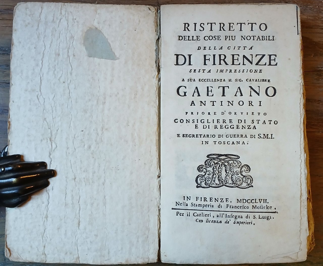 Ristretto delle cose più notabili della città di Firenze. Sesta impressione. A Sua Eccellenza il Sig. Cavaliere Gaetano Antinori, Priore d'Orvieto, Consigliere di Stato e di Reggenza e Segretario di Guerra di S. M. I. in Toscana.