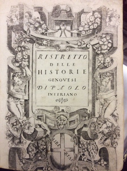 In-16 gr. (mm. 197 x 148), p. pergam. settecentesca, titolo oro su tassello al dorso, tagli gialli, 233 cc.num., compreso il bel frontespizio inquadrato in ricca cornice figurata, con stemma di Genova, inc. in rame; grande marca tipografica al verso dell'ultima carta. Rara "prima edizione" di questa interessante storia di Genova.Paolo Interiano, storico e astronomo genovese, tratta dettagliatamente delle origini delle città e ne descrive tutte le vicende storiche fino al 1506. I primi 4 libri sono dedicati alla storia di Genova fino al 1400, fino a quando la città nella grandezza sua si mantenne - dal quarto all'ottavo (e ultimo libro) l'esposizione dell'Interiano riguarda le vicende dal 1400 al 1506, vicende che si svolsero poco felicemente per la città.Cfr. Adams, I-146 - Lozzi,I, p. 347: Raro, e ora assai ricercato anco dai collettori di libri antichi sull'America, contenendo in fine sotto il titolo "Glorie di Cristoforo Colombo" i cenni biografici di lui e quelli della scoperta del nuovo mondo. Frontespizio corto al marg. infer., alone all'angolo infer. bianco su 5 cc., altrimenti fresco esemplare ben conservato, su carta distinta.