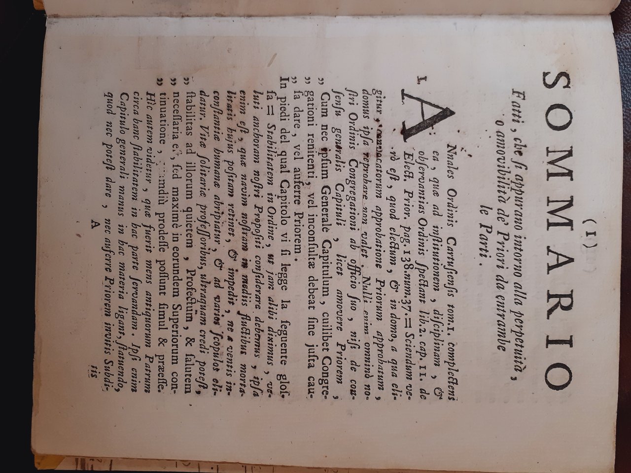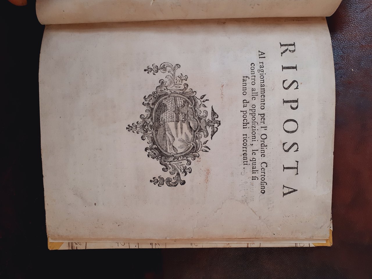 In 8vo piccolo; pp. XV (ma XXV), (1), XLVI, 1 c. b., da III a XIX, (1). Legatura moderna in mezza pergamena e carta antica manoscritta ai piatti; esemplare restaurato, con interventi sui margini di molte carte, e riportato a un ottimo stato conservativo. La seconda parte inizia con il proprio frontespizio, intitolata " Risposta al ragionamento per l'Ordine Certosino contro alle opposizioni, le quali si fanno da pochi ricorrenti". Rarissimo esemplare dedicato agli ordinamenti certosini.
