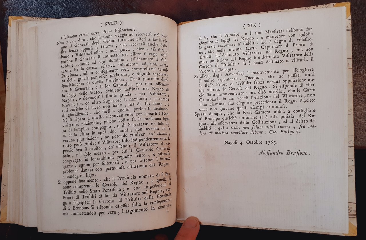 RISTRETTO DELLE RAGIONI della Real Certosa di S. Lorenzo della Padula contra la Carta del Capitolo Generale. (Unito) RISPOSTA Al ragionamento per l’Ordine Certosino contro alle opposizioni. (In fine: Alessandro Brussone, Napoli 28 Settembre (e 4 Ottobre 1763)