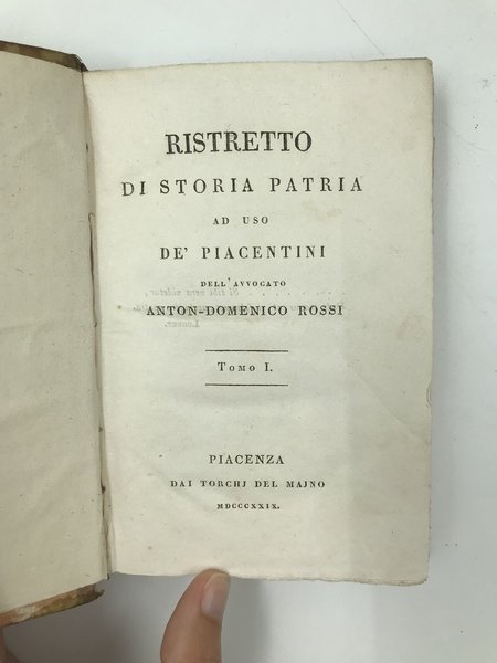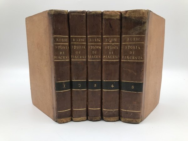 5 volumi in 8vo (155x102 mm). 424 p.; 443, [1] p.; 470, [6] p.; 492 p.; 603, [5] p. Legatura coeva in mezza pelle con piatti in cartonato bodoniano, titolo e filetti in oro ai dorsi (restauri alle cuffie). Buon esemplare. Prima edizione. Tra le più importanti fonti storiografiche per la città di Piacenza, la cui storia viene narata dalle origini sino agli anni dell'Autore con abbondanti richiami agli scrittori piacentini del passato. Per quanto pubblicata in forma tascabile, "ristretta", venne accolta come "la fonte a stampa unica, sicura, per l'ultimo Settecento e per il primo Ottocento piacentino".