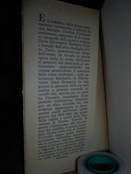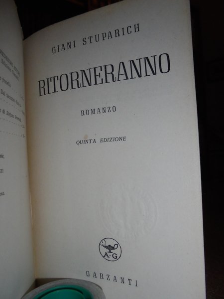 Giani, Stuparich. RITORNERANNO. Romanzo. Quinta edizione. Milano, Garzanti, 1942. In-16°, cartoncino edit. con alette. 627 pp. Ben conservato. Uff. scat. 10 stanzetta.
