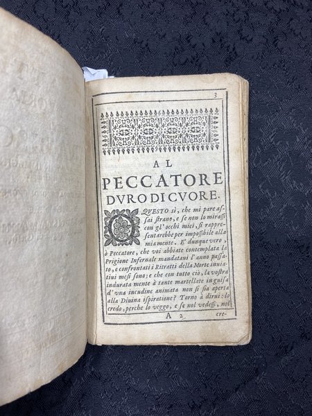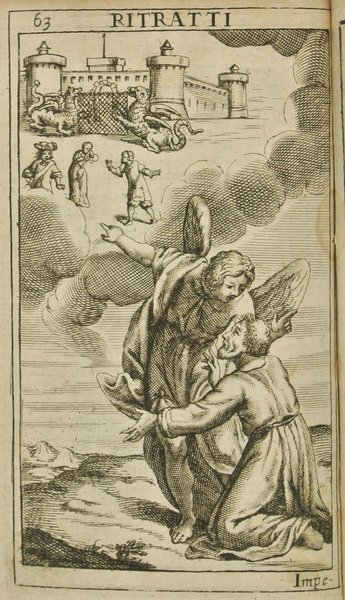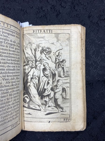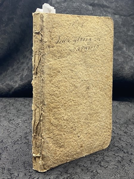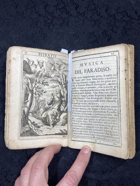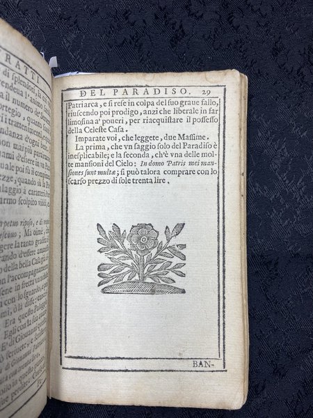 Legatura coeva cartonata alla rustica con cucitura a vista, titolo manoscritto sul piatto anteriore, 8vo cm10x16, pp 80 33 (1); emblema gesutico sui frontespizi, testo entro cornice, fregi xilografici, e 15 tavole incise fuori testo. GGiovanni Battista Manni, modenese, fu rettore di collegi gesuitici di Modena, Parma, Mantova, Bologna e Piacenza; ebbe una considerevole e fortunata produzione di opere a carattere devozionale in cui spaventose descrizioni di tormenti ultraterreni, corredate da figure incise, erano proposte al peccatore duro di cuore per ricondurlo alla fede (v. Sommervogel V 502, Graesse IV 367 e Piantanida 4789 e segg.). Per una volta distolto lo sguardo dalle miserie dei dannati, l'autore dedicò questo lavoro alle gioe della vita eterna, le musiche, i palazzi, l'estasi del Paradiso; l'opera apparve per la prima volta per i tipi di Hertz a Venezia nel 1670 e conobbe numerose edizioni. Volumetto di gusto popolare che stupisce con 15 gradevoli incisioni barocche che riprendono i temi dei capitoli; l'apparato iconografico è anonimo, dubbia l'attribuizione allo stampatore milanese Federico Agnelli (1626-1702), o alla sua bottega, giacché anche la precedente edizione veneziana è adorna di altrettante tavole