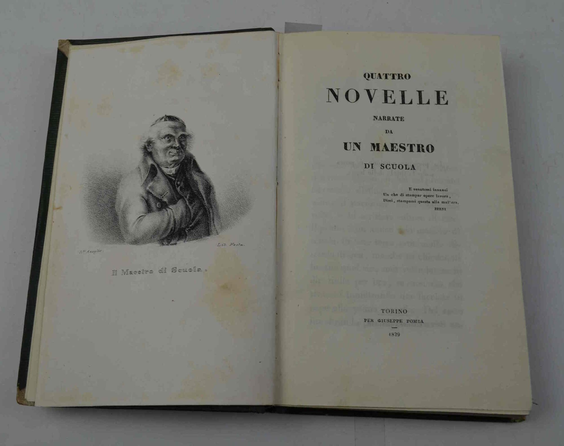 Due parti di pp. (8) 69 (1); 71 (1). Con 17 ritratti incisi su tavole f.t. Preceduto da: (BALBO CESARE) Quattro novelle narrate da un maestro di scuola. Torino, Pomba, 1829. Pp. 208. Con bel ritratto in litografia all'antiporta. Tre parti legate in un volume di cm. 20, solida legatura coeva on mezza pelle verde con titoli in oro al dorso. Bell'esemplare, marginoso e pulito. La seconda parte titola: "Lettera dell'Abate Stefano Arteaga alla signora Isabella Teotochi Albrizzi intorno alla mirra" e contiene anche la risposta dell'autrice all'Arteaga. Rara seconda edizione di quest'opera cui partecipò, come correttore, anche Ugo Foscolo. Cfr. Ottolini, n. 123.