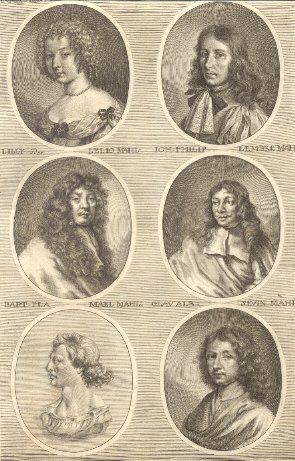 Incisione tratta da "Der Teutschen Academie", di cm. 37 x 24. Fioriture. L'incisione è formata da sei ritratti : Neubergerin A. F., Ambling, Lelio L., Lembke, Mael Bart, Sevin Glavalb.