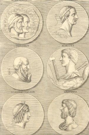 Incisione tratta da "Der Teutschen Academie", di cm. 37 x 24. Fioriture. L'incisione è formata da sei ritratti : Numa Pompilius, Ancus Martius, Philemon, M. Brutus, Tolomaeus P., Aristippus.