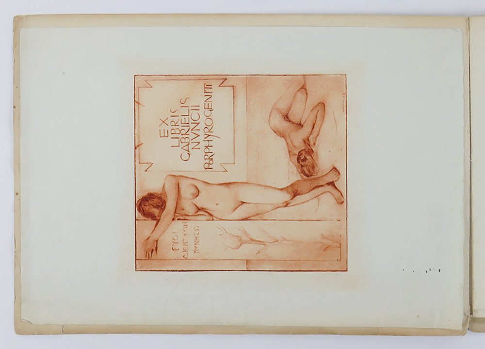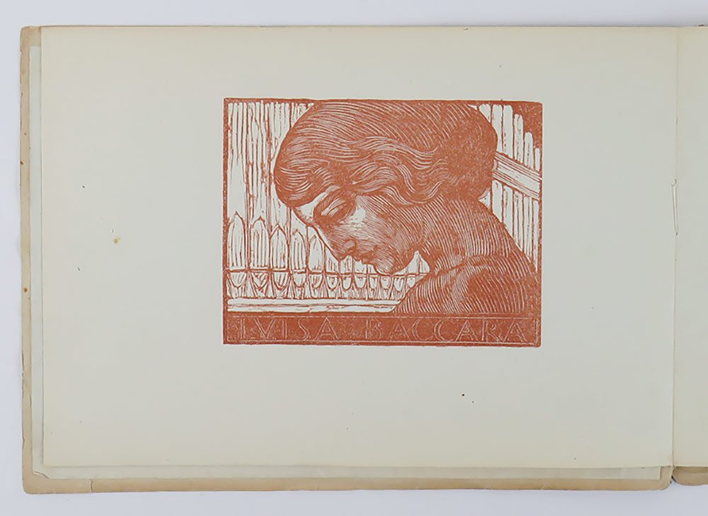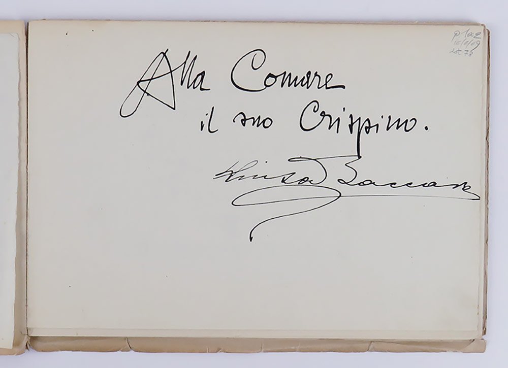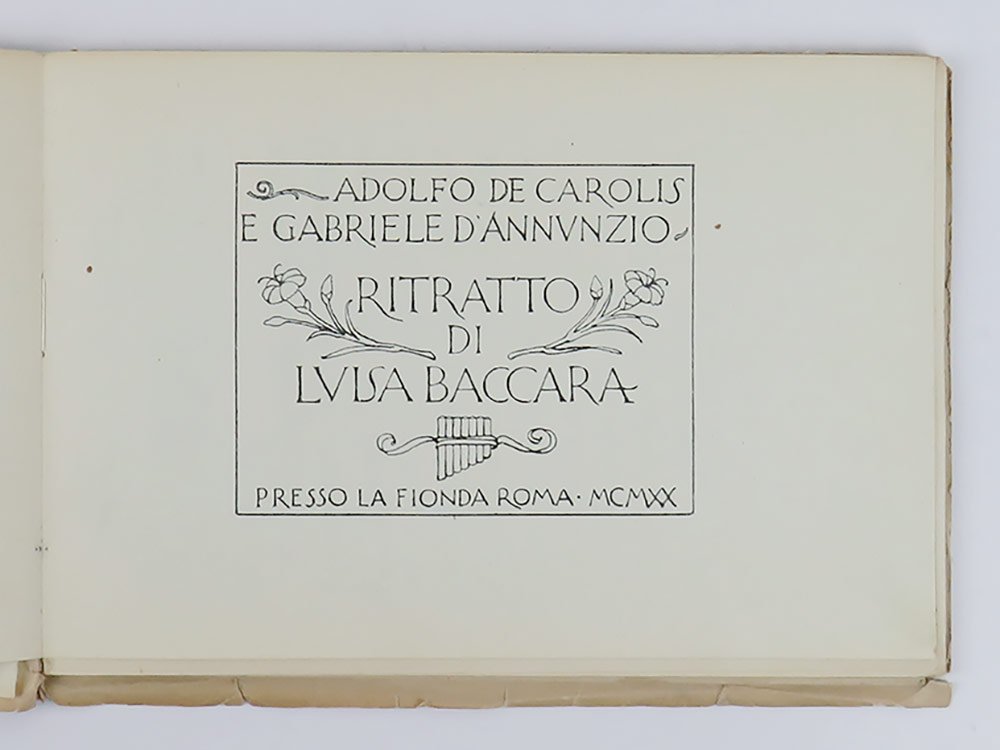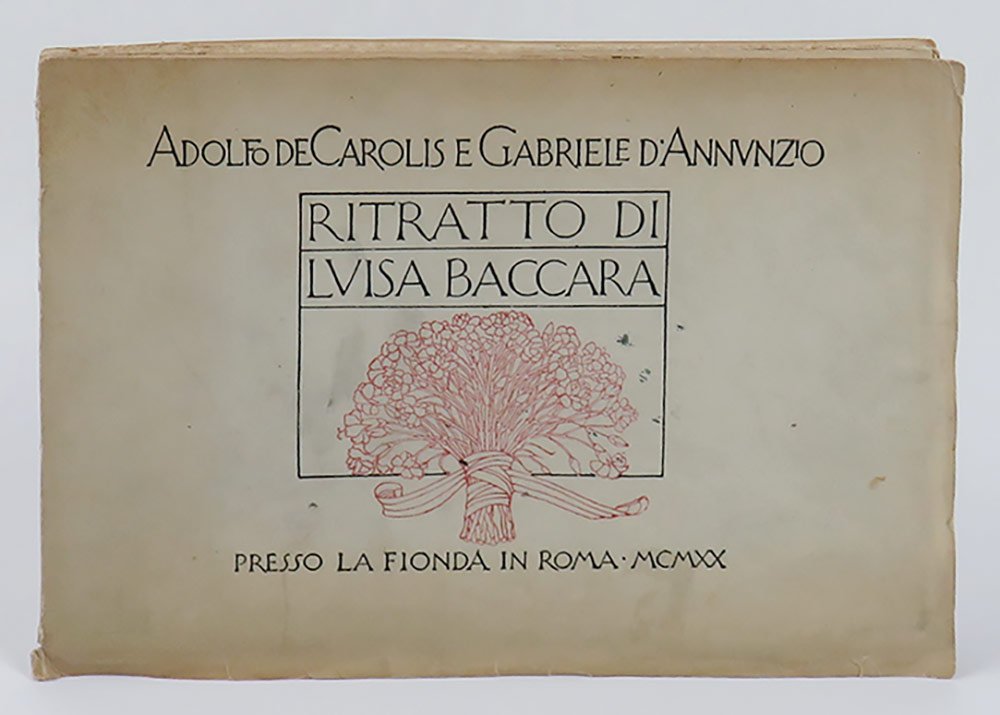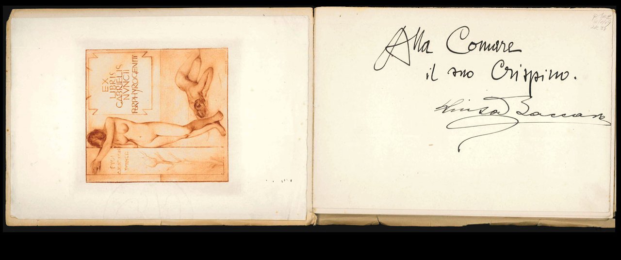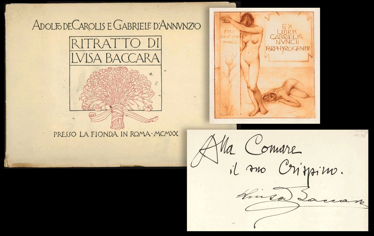 LIBROPrima edizione.CON AUTOGRAFO.Straordinario esemplare, storico: copia donata da D’Annunzio a una delle sue donne — molto probabilmente Antonietta Treves — con la dedica «Alla Comare | il suo Crispino» (con riferimento alla celebre opera dei fratelli Ricci), dedica subito seguita dalla firma autografa di Luisa Baccara, ovvero il soggetto del libro. Impreziosito inoltre dal raro «Ex libris Gabrielis Nuncii Porphyrogeniti» disegnato in acquaforte sanguigna da Giulio Aristide Sartorio, e applicato a margini interi a ricoprire tutta la seconda di copertina. L’esemplare conserva ancora la scheda bibliografica manoscritta della libreria antiquaria C. E. Bourlot di Torino, con sobria descrizione; apparso in un’asta romana del giugno 2007, è stato poi registrato in Ilaria Crotti, «Lo scrittoio immaginifico» (Avellino 2016, p. 188 nota 18).Raro libretto fuori commercio che testimonia ancora una volta l’eccezionale sodalizio artistico tra i due protagonisti di Fiume, D’Annunzio e De Carolis. L’opera è tutta incentrata su Luisa Baccara, pianista e amante del poeta, che si legò a lui nel 1919, lo seguì da Fiume a Gardone e gli rimase vicino fino agli anni del Vittoriale. A lei, innanzitutto, è dedicata la bellissima incisione in sanguigna di De Carolis, che apre il volumetto: «Leggermente inclinato il capo, elegante la linea flessa del collo, segnate le spalle, compatto il volume della capigliatura, [.] accentuato l’arco sopraccigliare che incornicia la fessura nera e concentrata dell’occhio sinistro, [.] ben disegnata la bocca dal sorriso trattenuto, [.] pronunciato il mento: elementi, codesti, che contribuiscono nel loro insieme a “scolpire” un bassorilievo cartaceo, mentre sullo sfondo, in verticale, svettano le canne di un organo che rileggono la performance musicale equiparandola a un rito sacro» (Crotti, p. 187). Il ritratto realizzato da De Carolis è seguito da quello composto da D’Annunzio, che si articola in due movimenti, a formare un dittico: il primo, intitolato «La figura» (uscito in prima istanza su «La Vedetta d’Italia», Fiume 20 febbraio 1920), prende le mosse proprio dall’incisione di De Carolis, intessendo con questa un dialogo serrato e dando conto «della personalità artistica della Baccara, della sua eccellenza e, soprattutto, delle fantasmagoriche rispondenze tra il corpo della pianista, il suo strumento e colui che reinterpreta questi fattori» (Crotti, p. 188). Il secondo, intitolato «La maestria» (pubblicato nel luglio 1920 sulla rivista «Poesia» diretta da Mario Dessy), pur continuando negli elogi della pianista, «grazie a riferimenti, citazioni, autocitazioni, digressioni, sconfinamenti e allusioni di vario tenore [.] è teso a fare interagire problematiche estetiche e musicali con assunti più spiccatamente ideologici» (Crotti, pp. 188-9). Il volumetto, per quanto poco noto ai non specialisti, nella sua veste tipografica di grande pregio e nella raffinata corrispondenza tra immagini e prosa si configura come una delle più pregevoli prove fiumane di D’Annunzio e De Carolis.Bibl.: Guabello, Raccolta dannunziana, n. 296-298; L. Crotti, Lo scrittoio imaginifico. Volti e risvolti del d’Annunzio narratore, Avellino, Edizioni Sinestesie, 2016.