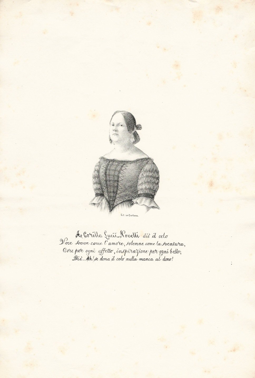 Lit. in Cortona [c. 1843], foglio volante di mm. 378x258. Sotto al ritratto la dedica (anch'essa in litografia): "A Corilla Lucii-Novelli diè il celo [sic] voce soave come l'amore, solenne come la sventura, core per ogni affetto, inspirazione [sic] per ogni bello [.]".