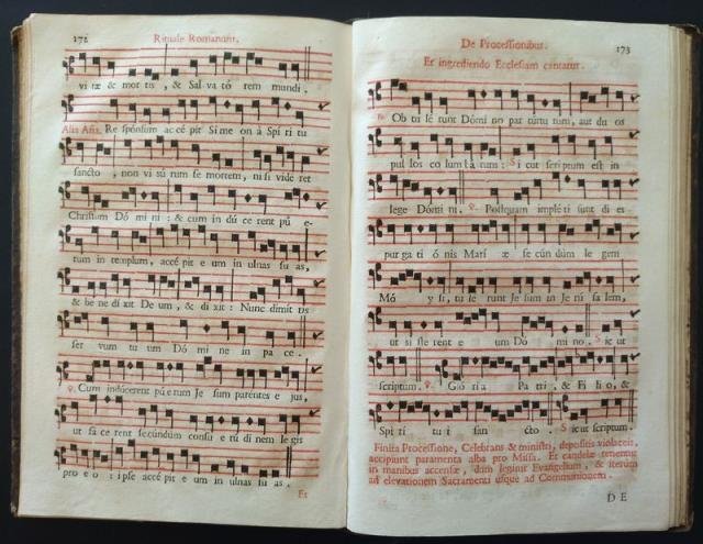 Ex Typhographia Balleoniana, 1784. In 8vo grande (cm 16 x 24), front. in rosso / nero con vignetta incisa in rame, pp. 248 (con Index et Ordo), testo interamente stampato in rosso / nero su doppia colonna, moltissime pagine sono framezzate da note musicali, contropiatti in carta decorata, tagli in oro, leg. orig. in p. pelle con tracce di filetti dorati ai piatti e al dorso. Legatura molto lisa e consunta, praticamente scomparse le finiture oro, bello e molto buono l'interno.