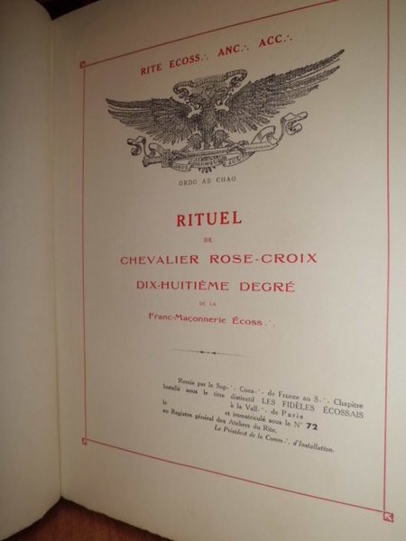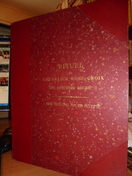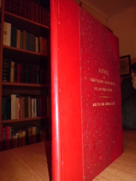 Sup:. Cons:. pour la France et ses dépendances. Rituel de Chevalier Rose - Croix. Dix - huitième degré de la Franc - Maçonnerie Ecoss:. (Paris), 1945. In - 4°. m. marocchino rosso con larghe punte, titolo in oro sul piano anteriore. 63, (2) pp. Stampato in rosso e nero su carta greve, testo entro riquadro rosso. Tiratura limitata per i soli iniziati; ristampa del 1845. Rarissimo, sconosciuta al Ferrer Benimeli. Neg. mob. 5
