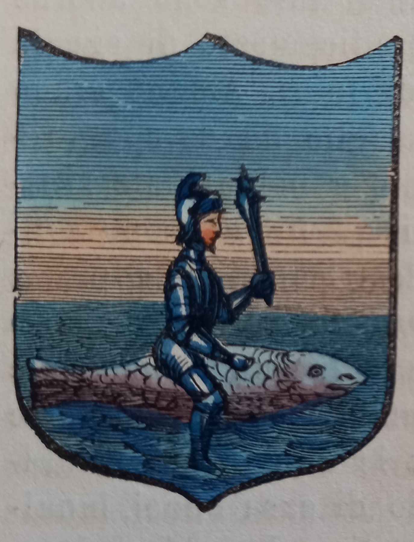 Piccolo stemma comunale colorato a mano d’epoca (cm. 3,8 x 3,2 ca.). Stralcio dal Dizionario Corografico illustrato dell’Italia, edito a Milano nel 1868. Ogni stemma di questa raccolta è inserito in una o più pagine di testo con la descrizione della località, notizie storico - geografiche e statistiche (numero degli abitanti e degli elettori, guarnigioni della Guardia Nazionale, ecc.). Spesso il testo è redatto da studiosi locali o dai sindaci, con maggiori, interessanti notizie.