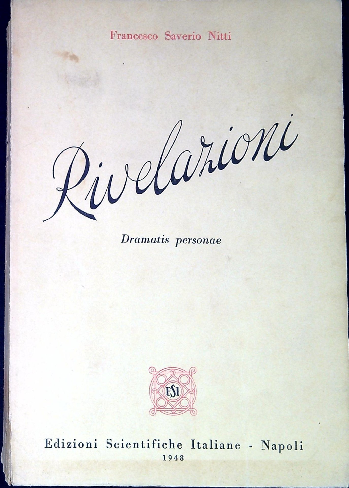 Nitti , Francesco Saverio Rivelazioni dramatis personae. Napoli, EDIZIONI SCIENTIFICHE ITALIANE 1948, ill. 24 cm. XXXVI, 623 p. (28858)