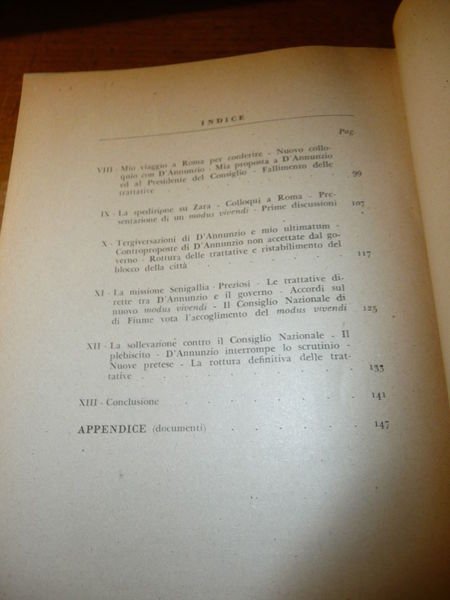 DESCRIZIONE: Donatello De Luigi Roma 1946 I^ ed. br. ed. ill. con sovracc. ill. con riproduzione di una missiva inviata a Badoglio dal Presidente del Consiglio Nitti. appendice di 81 documenti alle pp. 147 e sgg. Resoconto badogliano della sua attività, su incarico governativo, nel regolare la questione di Fiume (egli ricoprì la carica di Commissario Militare straordinario per la Venezia Giulia). Opera di grande interesse, che l'A. illustrava nella premessa: "Questo mio scritto ha inizio con l'azione di D'Annunzio e rappresenta una vera cronologia degli avvenimenti, basata però non su semplici ricordi, bensì su una documentazione da me riunita dal 13 set. al 23 dic.1919, nel qual periodo, incaricato dal Governo di regolare la questione di Fiume, ricoprii la carica di commissario militare straordinario per la Venezia Giulia.". CONDIZIONI DELL'OGGETTO: Ottime. PESO/WEIGHT: 281 g without package