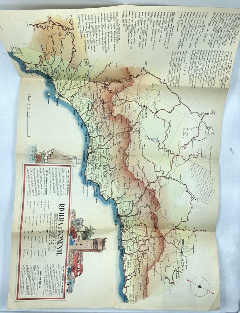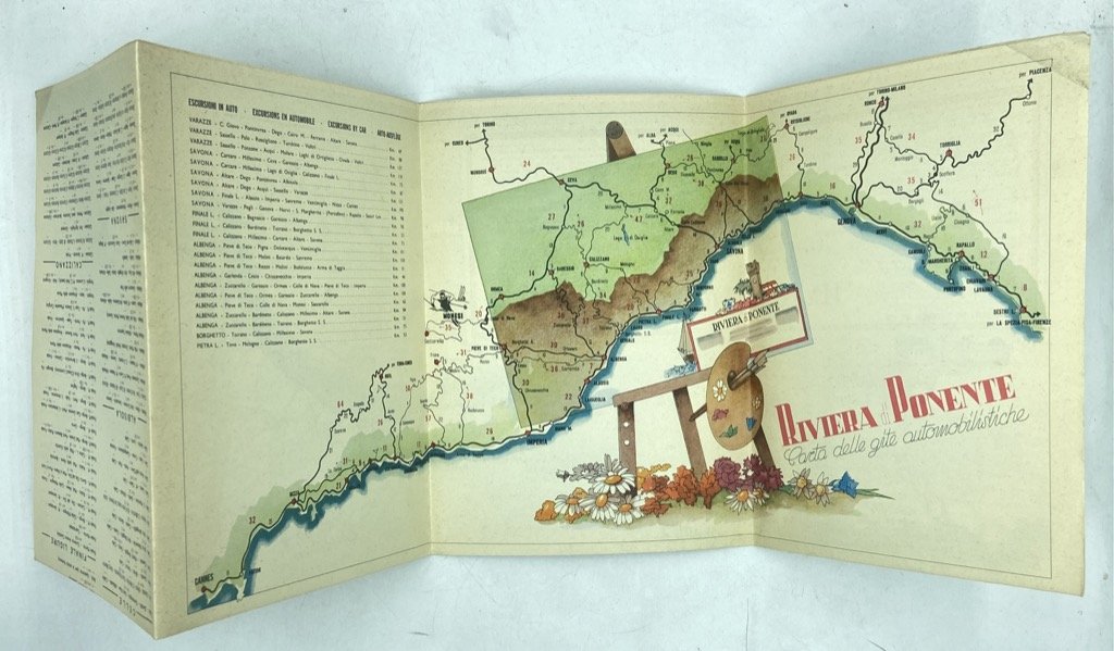 Pieghevole turistico a colori, cm 19 x 14 chiuso, cm 38 x 55 aperto, testo in italiano, francese, inglese e tedesco. Minuscola mancanza sul bordo superiore e lievi sgualciture sugli angoli, ma ben conservato. Depliant stampato verso la fine degli anni '50 dalla SAIGA (già Barabino e Graeve) per l’Ente Provinciale per il Turismo di Savona con la collaborazione delle Aziende Autonome di Soggiorno di Alassio, Albisola, Celle Ligure, Finale Ligure, Laigueglia, Loano, Pietra Ligure, Spotorno, Varazze e Club Alpino di Savona; la redazione del testo è di A. Parodi mentre il progetto grafico è del pittore Aldo Cigheri (Genova 1909 - Carmignano 1995), illustratore e cartellonista che col suo segno leggero, affine alla «ligne claire» francobelga, lasciò un segno indelebile nella comunicazione pubblicitaria nazionale firmando soprattutto nel secondo dopoguerra manifesti e cartine per numerosi enti turistici italiani. Accanto a due illustrazioni fotografiche troviamo dunque una sintetica mappa della Riviera di Ponente disegnata al tratto, con i principali monumenti e altri elementi di interesse, una carta stradale a colori accompagnata da cavalletto, tavolozza e fiori, e sull'intera faccia posteriore del volantino una grande carta a colori con alcuni elementi decorativi (auto, bus, fiori ecc). Il testo indica gli itinerari per gite ed escursioni da Varazze, Sassello, Celle, Albisola, Savona, Spotorno, Finale, Calizzano, Loano, Albenga, Alassio, Pietra Ligure e Ceriale; una tabellla segna le distanze per gite automobilistiche.