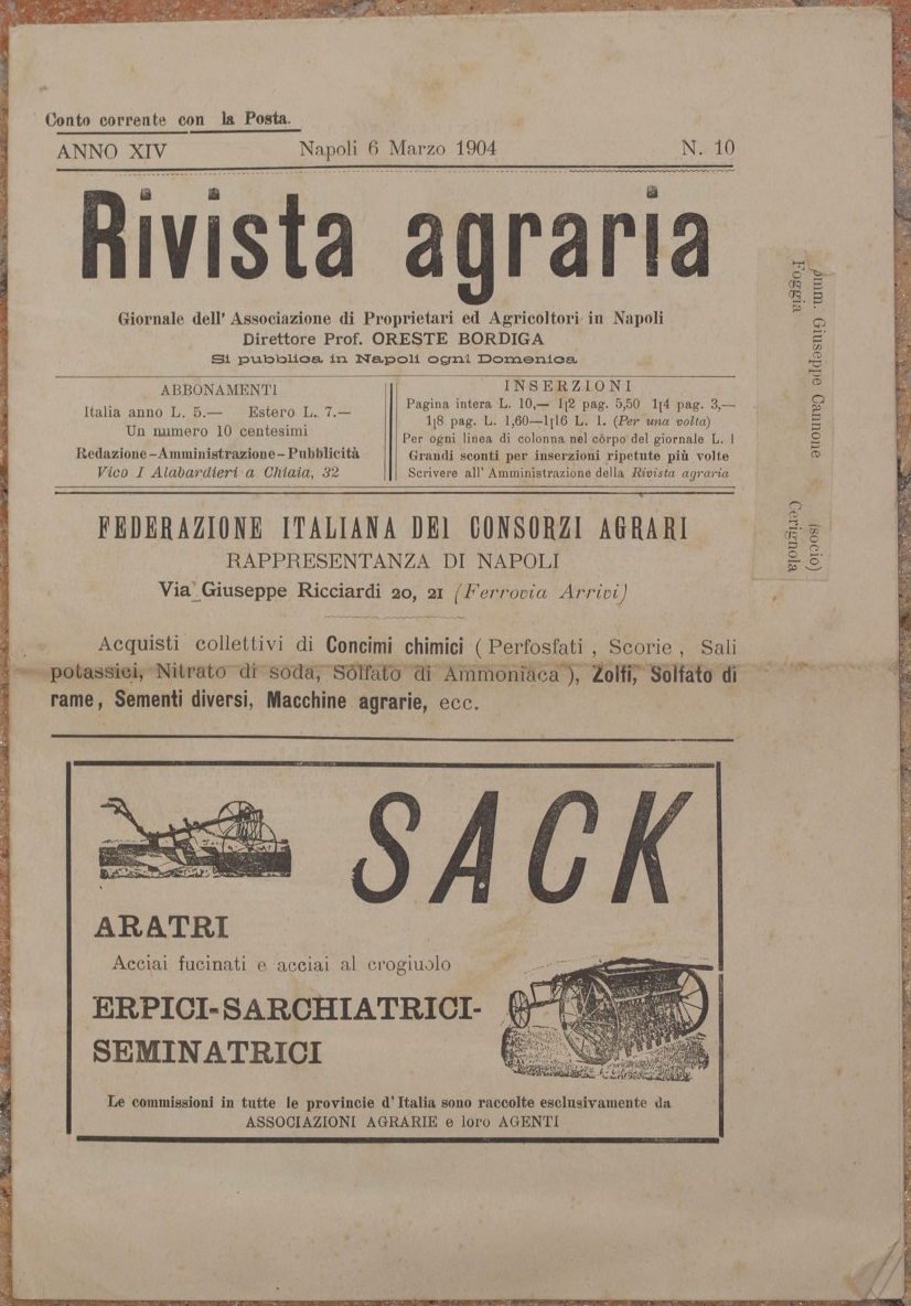 RIVISTA AGRARIA ANNO XIV - NAPOLI 6 MARZO 1904 - N. 10