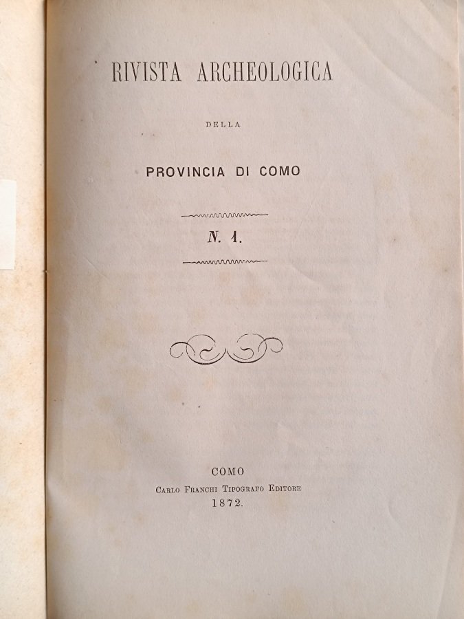 <span style="font-style: normal;">In-8° (cm. 24,5), brossura coeva muta (lievi fioriture, minime tracce d'uso); pp. 32 in stato molto buono (lievissime e sporadiche fioriture); </span><i>errata corrige</i><span style="font-style: normal;"> applicata al contropiatto anteriore. Edizione originale e per nulla comune del primo fascicolo del periodico archeologico lariano; ad aprire il testo vi è il </span><i style="font-style: normal;">Manifesto</i> della commissione. Tra le materie trattate vi sono «i monumenti pubblici e privati, gli oggetti di archeologia e di arte bella, la raccolta d'iscrizioni, di documenti, di tradizioni, di canzoni popolari, di voci vernacole e di nomi corografici, attenenti alla Provincia» [p.3]. Esemplare molto buono. (OP2)