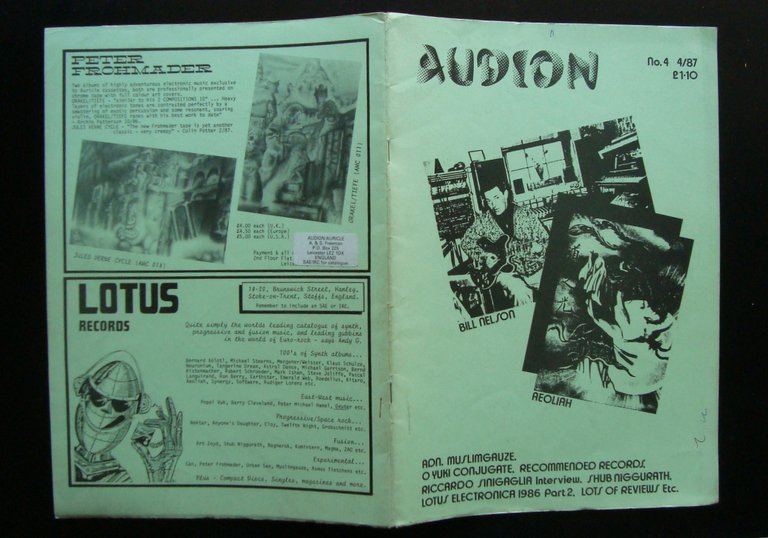 Rivista, Audion" N 4. April 1987 Editor Steve Freeman, Leicester, 1987, cm 29,5x21, pp. 31; br.ed con numerose ill. fotogr. in b/n , layout simil ciclostile. br.con peccette adesive dell'editore. Testi in inglese. Numero completo. Condizioni di conservazione Esemplare in buone condizioni con tracce d'uso e del tempo. Numero completo. Riccardo Sinigaglia intervieuw, Shub Niggursth OPEB.4115 blu "