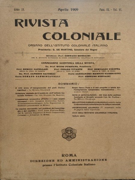RIVISTA COLONIALE APRILE 1909 POLITICA FONDIARIA BENADIR ON.DE MARTINO ISTITUTO COLONIALE ITALIANO