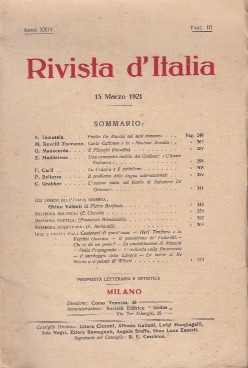 In-8 (Cm 25 x 17), pp. VIII da 250 a 379, brossura editoriale. Anno XXIV fascisolo III. Esemplare ancora parzialmente a fogli chiusi. Srappetto al dorso. OTTIMO - Sommario: Tamassia: Emilio De Marchi nei suoi romanzi - M. evelli Zuccante: Carlo Cattaneo e la Naziona Armata - Manacorda: Il filosofo (Novella) - Maddalena: Una commedia inedita del Goldoni: L'avare Fastuex - Carli: La Francia e il socialismo - Bellezza: Il problema della lingua internazionale - Grabher: L'azione muta nel teatro di Salvatore Di Giacomo - Gli uomini dell'Italia odierna - Pietro Bonfante: Ghino Valenti (.) - Idee e fatti: Tra i centenari di quest'anno - Neri Tanfucio e la Vecchia Guardia - Il passatismo de' Futuristi - Chi ci da un poeta? - La smobilitazione di Mazzini - Della Propaganda - L'inchiesta sulla burocrazia - Il saccheggio delle Librerie - La morte di Re Nicola e il pianto di Wilson