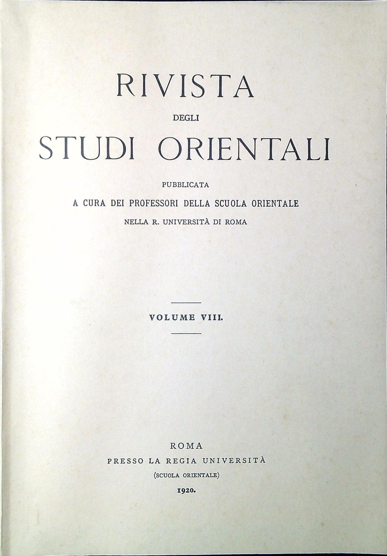 Rivista degli Studi orientali Volume VIII. Roma, presso la Regia Università 1920, 869 p. ; 25 cm (71340)