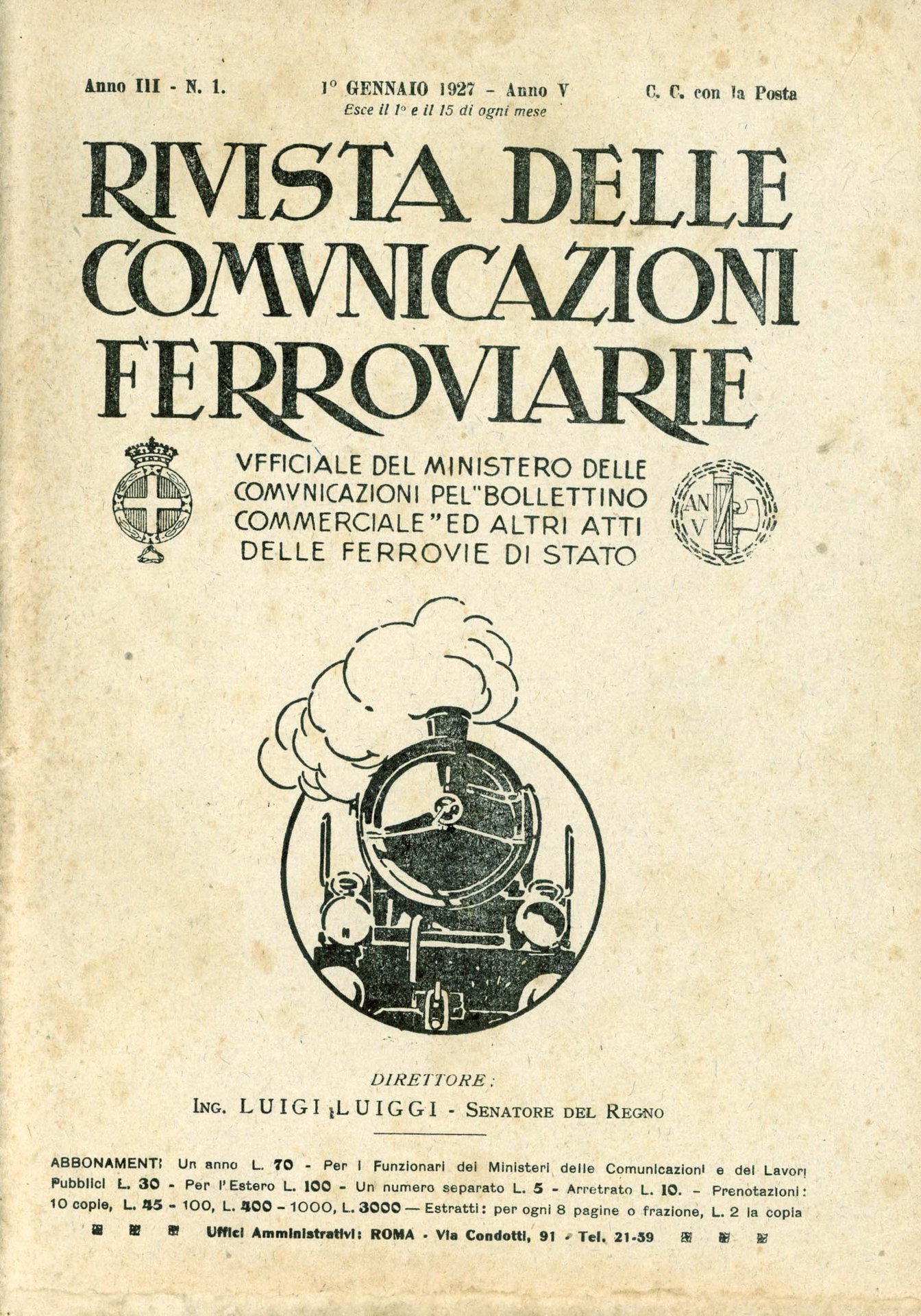 Anno III, n. 1. 1^ Gennaio 1927. Illustrazioni e pubblicità d'epoca. L'Istituto sperimentale delle Ferrovie, l'Anschluss dell'Austria alla Germania dal punto di vista ferroviario, Prezzi di mercato, ecc. 385 � Ba In Quarti ( 24-30cm ) Buono (Good) Buono