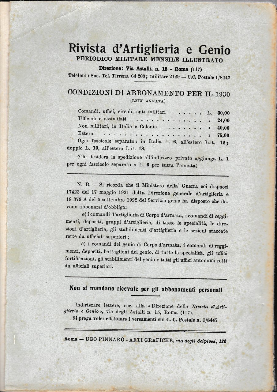 Rivista di Artiglieria e Genio. 69^ annata, fascicolo IX-X, Settembre-Ottobre 1930