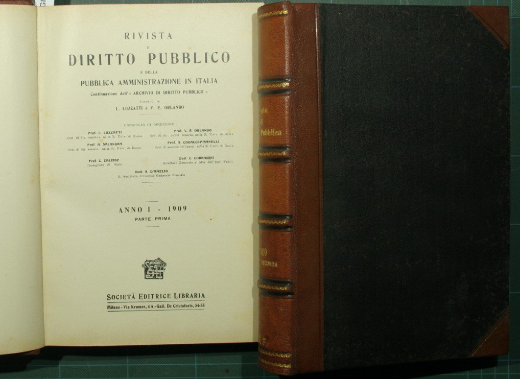 Continuazione dell'Archivio di diritto pubblico - Fondato da L. Luzzatti e V.E. Orlando - Collana Rivista di diritto pubblico e della pubblica amministrazione in Italia. Anno I - in 8° - pp.588; 604 - Mezza pelle con titolo e fregi in oro al dorso nervato - Due volumi - Tagli rossi