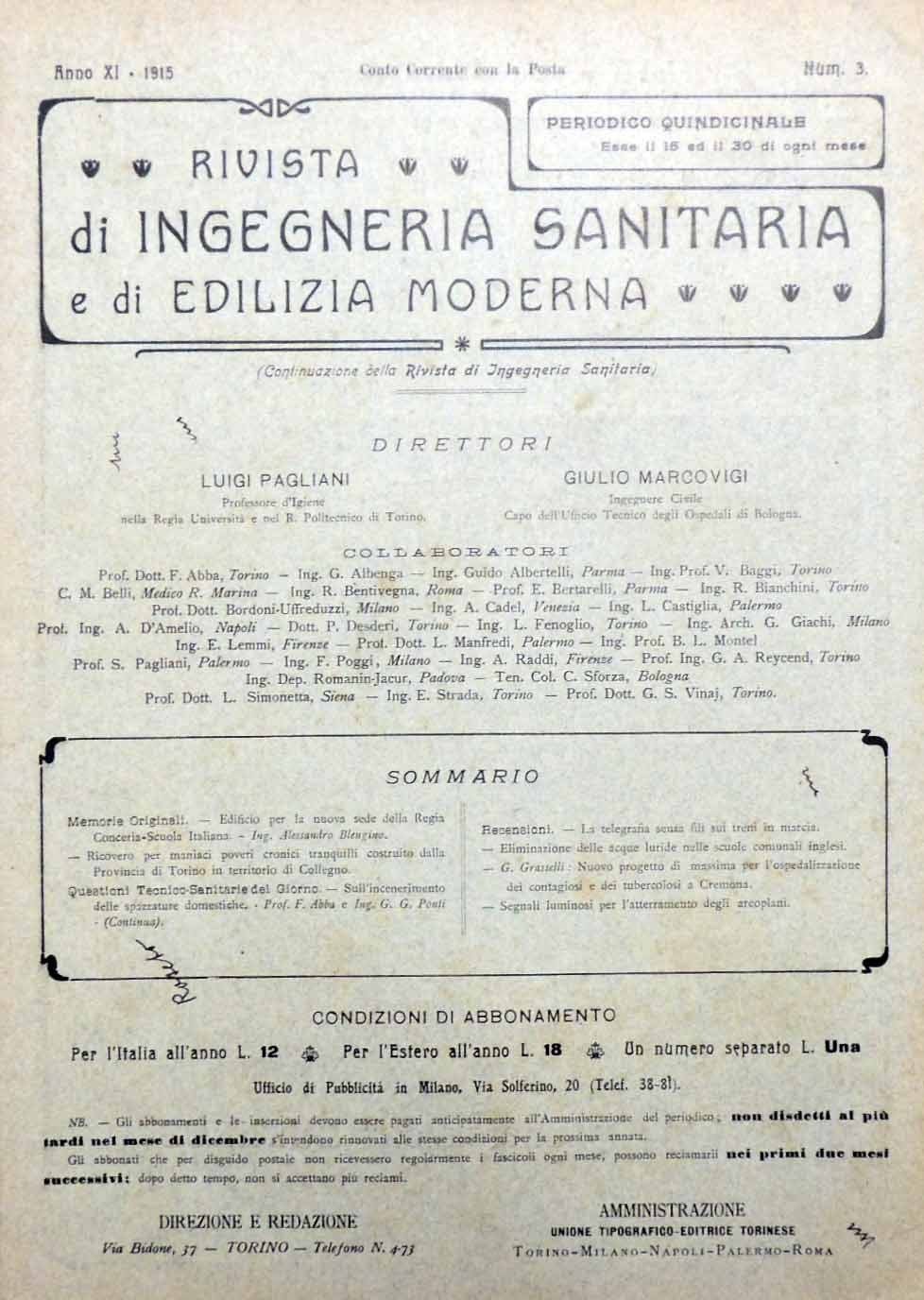 Rivista di ingegneria sanitaria e di edilizia moderna. (Continuazione della Rivista di Ingegneria Sanitaria). Periodico quindicinnale, direttori Luigi Pagliani e Giulio Marcovigi, collaboratori F. Abba et al., Torino, anno XI, 1915, 8 numeri non consecutivi, pp. totali XIII, 92 (92), ill. b.n., cm 32, fascicoli rilegati a punto metallico. Il lotto comprende i seguenti otto fascicoli della rivista Rivista di ingegneria sanitaria e di edilizia moderna. Periodico quindicinnale: a. XI, n. 3, 15 febbraio 1915, pp. 25-36 (5-16) – a. XI, n. 6, 30 marzo 1915, pp. 61-72 (5-16) – a. XI, n. 9, 15 maggio 1915, pp. 97-108 (16) – a. XI, n. 12, 30 giugno 1915, pp. 133-144 (3-14) – a. XI, n. 17, 15 settembre 1915, pp. 193-204 (5-12) – a. XI, n. 19, 15 ottobre 1915, pp. 217-228 (1-12) – a. XI, n. 21, 15 novembre 1915, pp. 241-252 (5-12) – a. XI, n. 24, 30 dicembre 1915, pp. 277-284, XIII, (5-16). Indici: A. XI, n. 3: A. Blengino, Edificio per la nuova sede della Regia Conceria-Scuola Italiana – Ricovero per maniaci poveri cronici tranquilli costruito dalla Provincia di Torino in territorio di Collegno – F. Abba, G. G. Ponti, Sull’incenerimento delle spazzature domestiche – Recensioni (La telegrafia senza fili sui treni in marcia – Eliminazione delle acque luride nelle scuole comunali inglesi – G. Grasselli, Nuovo progetto di massima per l’ospedalizzazione dei contagiosi e dei tubercolosi a Cremona – Segnali luminosi per l’atterramento degli aeroplani). A. XI, n. 6: D. De Mascellis, Il lago artificiale di Muro Lucano (continua) – V. Rondani, Il Cortile della casa di abitazione studiato sotto il rapporto architettonico ed igienico (continua) – B. E., Padiglioni e baracche italiani – E. Bertarelli, Diluzione delle acque luride nei corsi di acqua e limiti di tolleranza – Recensioni (F. Ruffolo, Bonificazione ed irrigazione della grande pianura di Sibari – Garcon Jules, L’uso dell’ozono per la ventilazione – Rifornimenti di acqua sui campi di guerra – Sistema per impedire gli incendi nei grandi depositi di benzina o di altri liquidi infiammabili – Prescrizioni igieniche circa il soffiamento a bocca nelle vetrerie francesi). A. XI, n. 9: L. Pagliani, Applicazioni dei ventilatori a forza centrifuga alla ventilazione degli ambienti ed alla estrazione delle polveri e dei gas nelle industrie – E. B., Il nuovo mercato generale di Roma – E. B., La utilizzazione agricola delle acque luride e il quesito degli ortaggi – B. E., Inquinamento di un pozzo per rigurgito di un sifone terminale della fognatura domestica – Recensioni (L’uso delle traversine in cemento armato nella costruzione delle linee tramviarie – L’allontanamento della polvere prodotta nelle mole a secco – T. Finocchio, Il Manicomio provinciale di Cogoleto – Sunden, L’influenza dei globi protettori sulla durata delle lampade ad incandescenza a filamento metallico – Rigg Gilbert, Il deterioramento dei mattoni refrattari – Modo economico di provvedere di acqua calda le abitazioni operaie – Le vernici preservanti il ferro esposto all’aria salina – Q. Guicciardi, Il cemento armato nei serbatoi per l’acqua potabile – La congelazione del latte per i trasporti a distanza). A. XI, n. 12: Pepione, Padiglione (Chalet) sulla sponda del Po per la Società Canottieri Eridano (continuazione e fine) – S. Pagliani, Sulla temperatura interna dei forni a zolfo – E. B., Le maschere protettrici per i gas tossici – E. B., Case mal costruite e pericoli per gl’insetti parassiti dell’uomo – Recensioni (A. Giannuzzi Savelli, Il nuovo ospedale militare di Torino – Duguet, Rapporto sul sistema di pulizia e di disinfezione in uso nella ferrovia metropolitana di Parigi – Gli effetti del fuoco sulle costruzioni in cemento armato delle officine Edison – Prescrizioni inglesi circa la composizione del catrame usato per incatramare le strade – Involucri di cellulosa per le derrate alimentari). A. XI, n. 17: L. Pagliani, Scuola di meccanica e di orologeria in Neuchatel (continua) – La previdenza nei cinematografi – E. B., I pericoli della diffusione del gas tossico – E. Bertarelli, Il concetto di casa buona – Recensioni (Nuovo tipo di spazzatrice elettrica per la neve – J. Barth, Alterazioni prodotte nei tubi di cemento dalle acque di rifiuto industriale – I. Maillard, Difese per macchine perforatrici di metalli – Ronbaud, la distruzione delle mosche e la disinfezione dei cadaveri nella zona di guerra – Il Permutit e la sua efficacia per rendere meno dure le acque) – Notizie. A. XI, n. 19: V. Negro, Tipi di case moderne antisismiche per la classe media e popolare (continua) – G. Mazzoni, Servizi di soccorso e case cantoniere – G. Marcovigi, Cenni sulla requisizione dei locali occorrenti alla spedalizzazione dei militari in tempo di guerra – P. Canalis, Badiamo ai cessi! – Recensioni (G. Pizzamiglio, Il nuovo padiglione chirurgico Zonda all’Ospedale maggiore di Milano) – Notizie. A. XI, n. 21: D. De Mascellis, Le opere di risanamento dei piccoli Comuni della Basilicata – S. Pagliani, Le correnti vaganti degli impianti di trazione elettrica e le costruzioni in cemento armato – Bertarelli, Sopra il valore di alcuni comuni indici di inquinamento delle acque potabili – Id., Intorno ad un facile artifizio per migliorare la illuminazione del tavolo di lavoro nei banchi di scuola – Recensioni (G. V., le vetture-filtro del Touring Club per l’esercito francese – vasca per l’allenamento dei palombari della Marina negli Stati Uniti – La depurazione delle acque residuarie delle latterie – Perrine Harold e Strehau George, L’uso di un nuovo cemento ricco di cenere – Un nuovo metodo per riconoscere la germinabilità delle cariossidi o in genere dei semi). A. XI, n. 24: L. Pagliani, Edifizi scolastici con ripari sanitari e con decorazioni artistiche in Bernsdorf N. O. (continuazione e fine) – G. Angelucci, Autoscale girevoli – Bertarelli, Lampade p