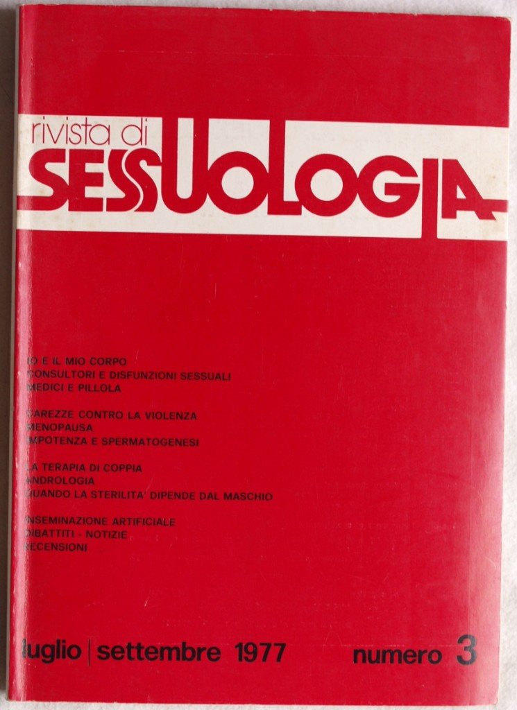 In 8. Dim. 24x17 cm. Pp. 96. Interessante rivista di sessuologia destinata a specialisti del settore del Luglio Settembre 1977 diretta da Capelletti. Tra gli argomenti trattati: consultori e disfunzioni sessuali; medici e pillola; carezze contro la violenza; menopausa; impotenza e spermatogenesi; la terapia di coppia; andrologia; quando la sterilità dipende dal maschio; inseminazione artificiale. Qualche figura all'interno. In buone condizioni. Brossura editoriale in buone condizioni generali con lievi usure ai margini e dorso. Interesting magazine of sessuology destinated to specialists of the field of the July September 1977 directed by Capelletti. AMong the issues treated: sexual disfunctions; therapy of couple; andrology; the cause of sterility; artificial insemination. Some figure inside. In good conditions. Editorial cover in good general conditions slightly worn in the edges and spine.