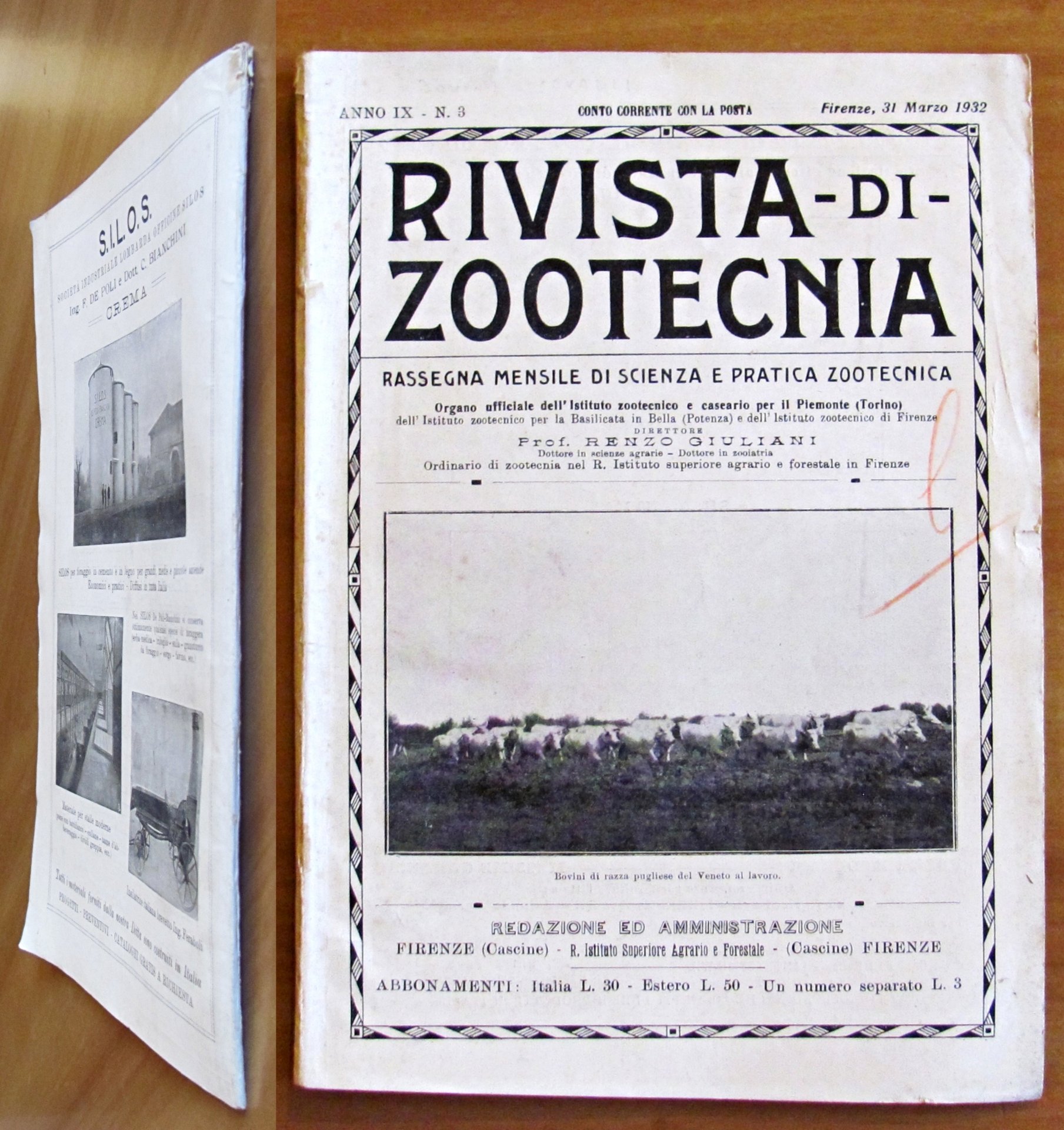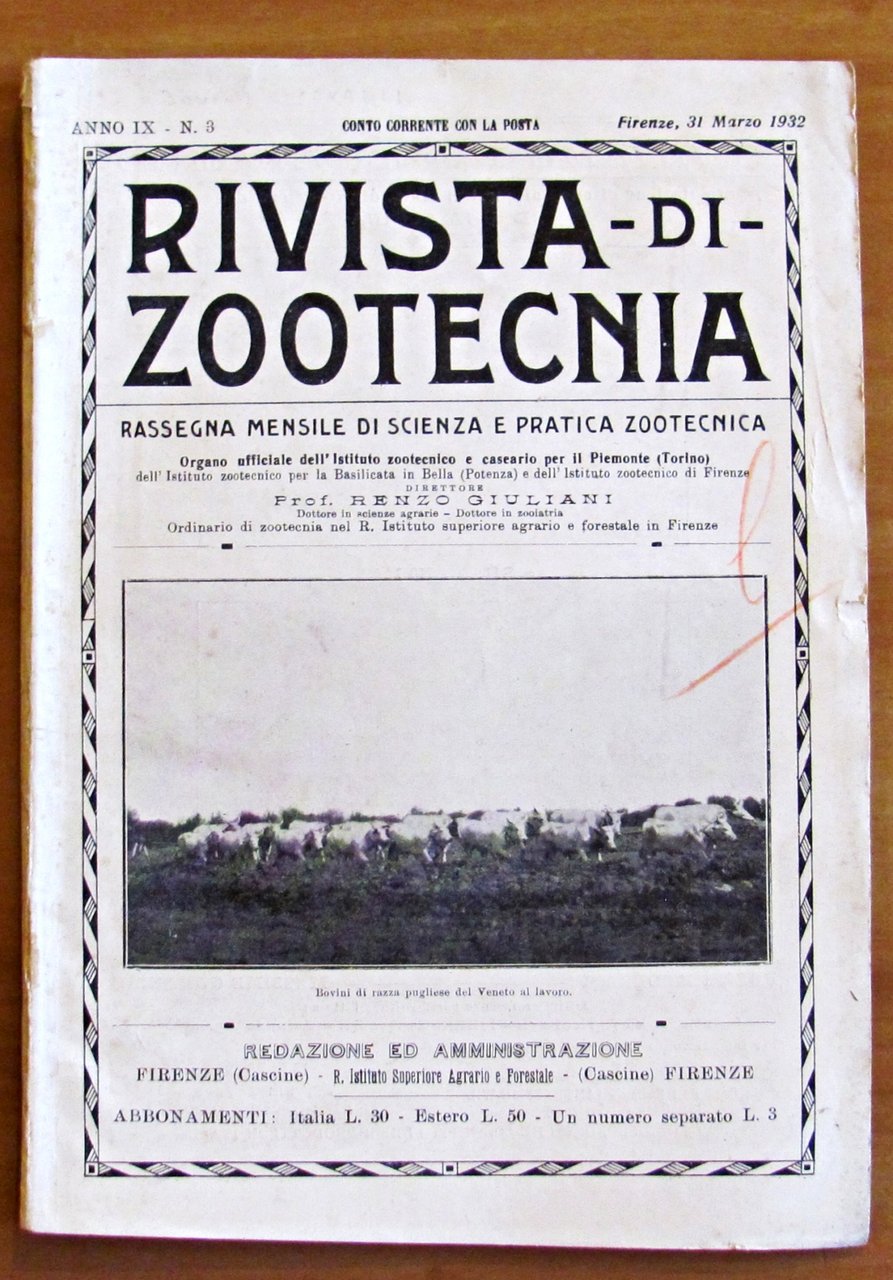 Rivista di zootecnia. Rassegna mensile di scienza e pratica zootecnica. Anno IX N.3, 31 Marzo 1932. Moltissime illustrazioni, anche fotografiche, in b/n n.t. e belle pubblicità del tempo. Regio Istituto Superiore Agrario e Forestale. Firenze, 1932. Brossura editoriale con lievi imperfezioni del tempoal dorso e qualche segno a matita colorata in qualche pagina (come da foto). Peraltro interno in Ottimo stato. 17x24,5. Buonissimo stato. , Ottimo (Fine)
