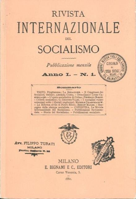 1 v. (pag. varia) : ill. ; 24 cm. Campi del sapere. Riproduzione facs. dell'edizione: A. 1, n. 1 (15 mag. 1880)-a. 1, vol. 2, n. 2 (31 dic. 1880). Milano : E. Bignami, 1880. Presentazione di Giampietro Berti. «II socialismo è la più alta espressione della perfettibilità dell'uomo. La questione sociale e il socialismo sono naturalmente internazionali e perciò assumiamo il titolo di Rivista internazionale del socialismo. Da Campanella a Ferrari la varietà delle forme assunte dal socialismo non toglie che vi siano principi generali comuni ai socialisti tutti». La collaborazione di Roberto Ardigò conferma alla rivista il prevalente indirizzo scientifico positivista. Andrea Costa commenta in una lucida relazione l'indirizzo presentato dai socialisti legalitari al Congresso di Milano (1880) per la fondazione del Partito e per stabilire i principi sui quali dovrà regolare la sua condotta, nonché i mezzi per la graduale emancipazione del proletariato, non esclusi il metodo rivoluzionario e quello legale della partecipazione alla vita pubblica, ai fini della propaganda socialista. L'arresto improvviso del Costa interrompe la pubblicazione di questa sintesi programmatica con la quale egli si proponeva di dare al Partito un sostanziale carattere operaio, secondo i fondamentali principi della Internazionale. Ebbero larga parte nella collaborazione alla rivista rivoluzionaria alcuni Russi emigrati, evidentemente attratti a tale collaborazione dalla presenza, nella redazione, della Kuliscioff. Pubblica scritti di Eugènie Pierre sul matrimonio, del De Franceschi su Comunismo e socialismo, del Labusquiere su Darwinismo e socialismo, del Converti su La proprietà; scritti varii sulla teoria della proprietà secondo Proudhon e sulla teoria marxista del valore; estratti dal Saggio su la rivoluzione di Carlo Pisacane; note critiche di letteratura socialista in Italia, condotte da Osvaldo Gnocchi-Viani, e una rassegna della stampa periodica socialista italiana. Pubblica il resoconto dei Congressi socialisti di Parigi e di Germania (1880). Fondatore e direttore: Andrea Costa; amministratore resp.: Cesare Baggi; collaboratori: Anna Kuliscioff, Luigi Castellazzo, Federico Borde, Osvaldo Gnocchi-Viani, Michele Dragomanov, Benoit Malon, Eugènie Pierre, Emilie Massard, G. De Franceschi, A. Pistoiesi, Paolo Brousse, Leone Metchnikoff, Adhémard Ledere, Arturo Arnould, Eliseo Reclus, S. Podolinsky, Luigi Azzali, Pasquale De Silva. Brossura editoriale, coperta in cartoncino flessibile colorato (rosa). Codice libreria 2535.