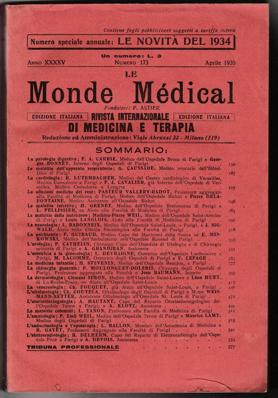 RIVISTA INTERNAZIONALE DI MEDICINA E TERAPIA LE MONDE MEDICAL APRILE 1935 NUMERO 173 COPERTINA MORBIDA EDITORIALE DI COLORE ARANCIONE LEGGERMENTE SBIADITO CON QUALCHE PIEGA AL MARGINE INTERNO DORSO CON PIEGHE E PICCOLI STRAPPI AL MARGINE SUPERIORE, QUARTA DI COPERTINA CON PIEGHE, INTERNO IN BUONO STATO IN ITALIANO, UNO STRAPPO AL MARGINE ESTERNO DELL'ULTIMA PAGINA NUMERO PAGINE 580, DIMENSIONI CM 22,8 X 16,5 4