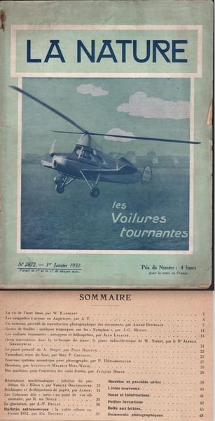 LA NATURE-LES VOILURES TOURNANTES-N∞ 2872-1 JANVIER 1932. PP. 48†PIŸ' PP. 8 DI†PUBBLICIT¿. CM. 29 X 22. BELLA RIVISTA DI INIZIO SECOLO, TRATTA DI INVENZIONI TECNOLOGICHE, AEREONAUTICA, ARCHEOLOGIA, ASTRONOMIA E MOLTI ALTRI ARGOMENTI. RARA. BUONE CONDIZIONI COPERTINA CON QUALCHE FIORITURA E UNA MANCANZA ALLA QUARTA DI COPERTINA DI CM. 18 X 3 CIRCA. QUALCHE MACCHIA ALL'INTERNO, STRAPPI MARGINALI ALLA COPERTINA.