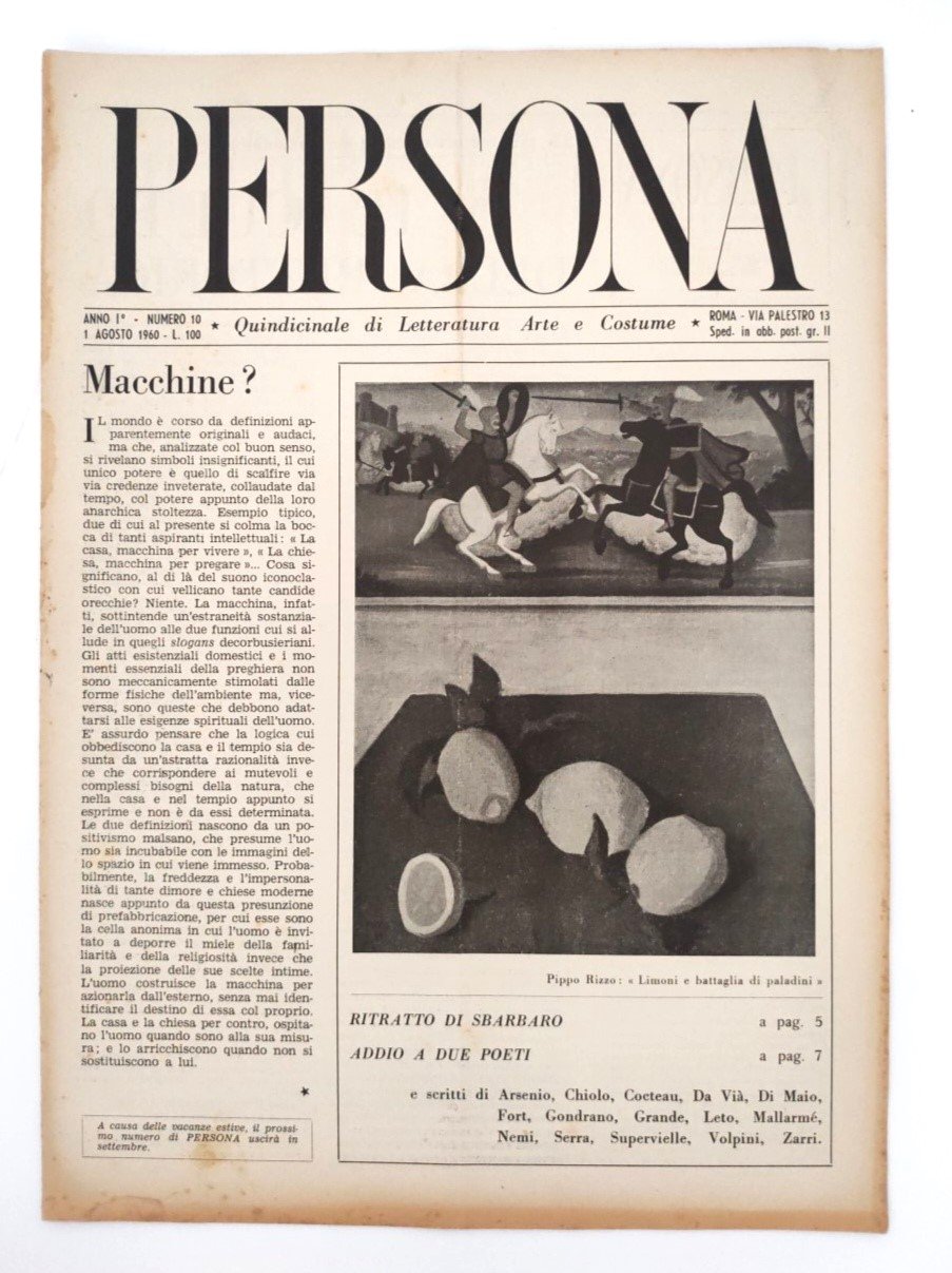 Rivista PERSONA Anno I, N. 10 1° Agosto 1960 quindicinale di letteratura, arte costume