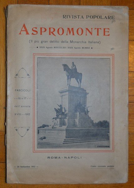 Rivista Popolare ASPROMONTE (il più grande delitto della Monarchia Italiana). XXIX Agosto MDCCCLXII - XXIX Agosto MCMXII. Fascioli 16 e 17 dell'annata XVIII 1912.