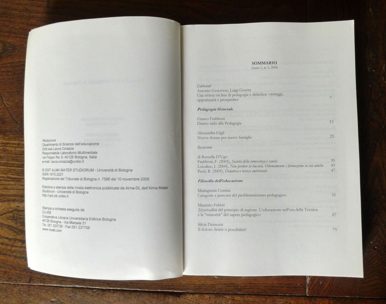 RICERCHE DI PEDAGOGIA E DIDATTICAAnno I n.1 2006.Direttore responsabile: Franco Frabboni.Direttori scientifici: Antonio Genovese,Luigi Guerra.Alma Mater Studiorum - Università di Bologna/CLUEB, Bologna 2006,brossura, 24x17 cm., pp.330,peso: g.600